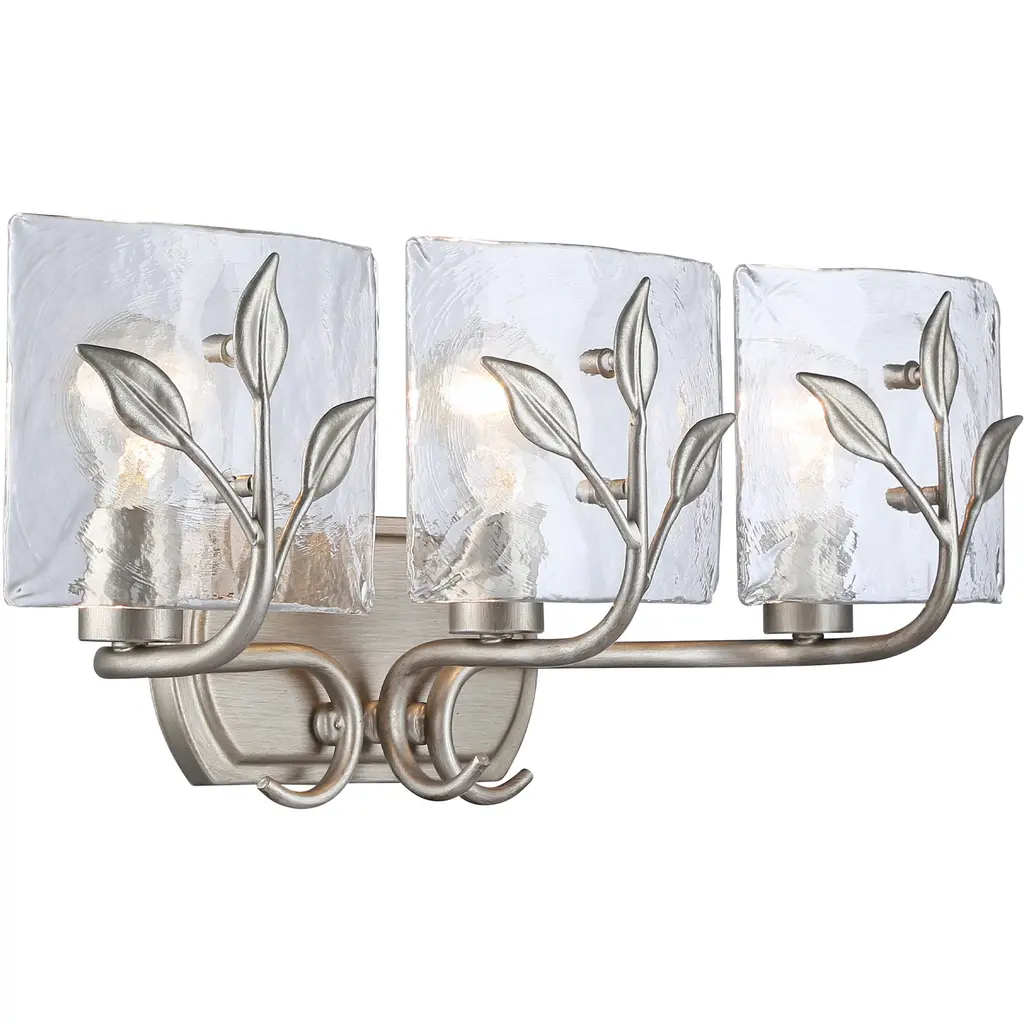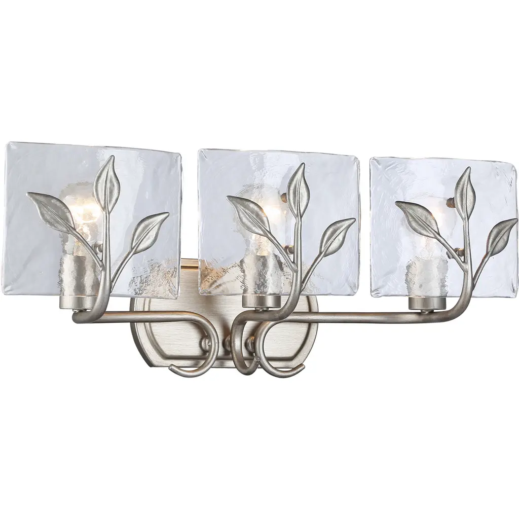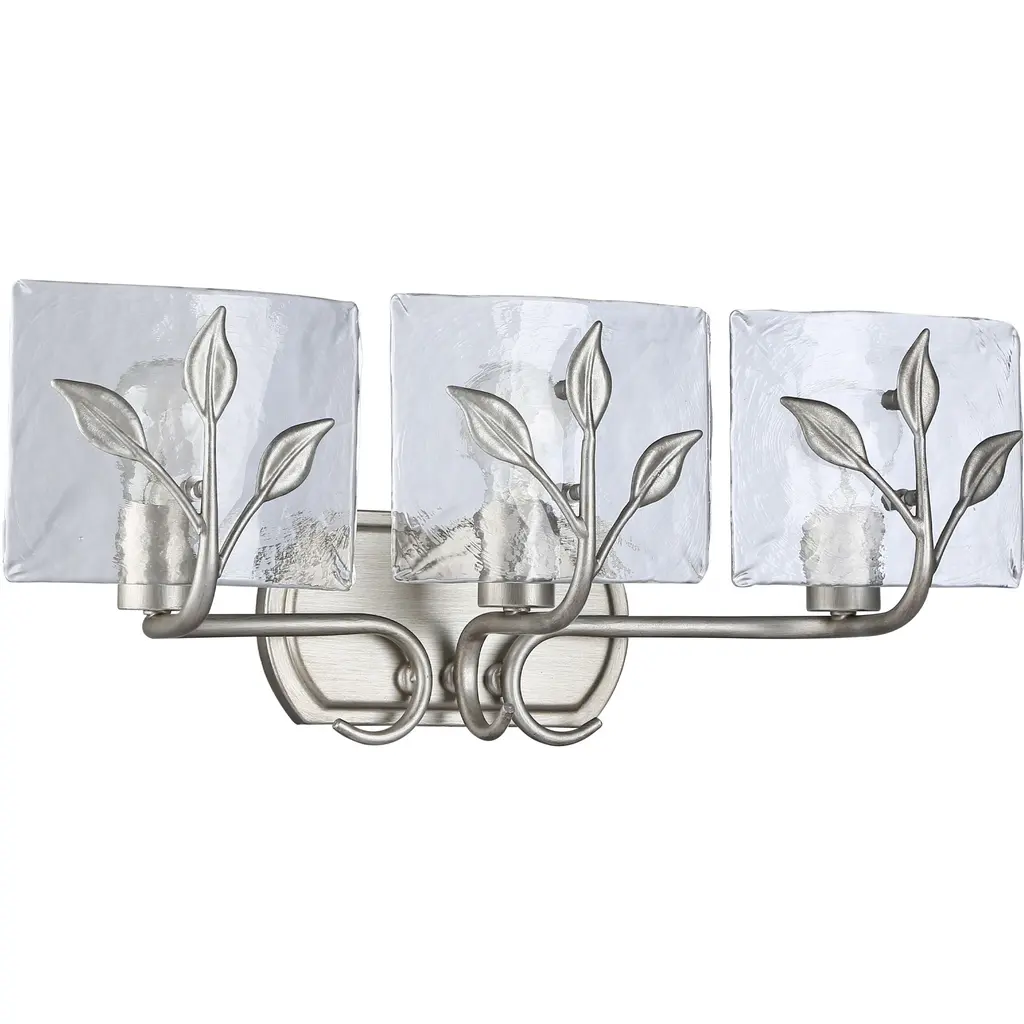 Bring nature-inspired elegance into your home with the Golden Lighting Calla 3-light Vanity in Peruvian Silver. Featuring a hammered water glass shade and a Peruvian Silver frame, it creates a welcoming atmosphere. The hammered water glass shade offers a heavy, irregular texture that not only refracts light beautifully but also adds an artisanal touch to your decor. This unique finish, inspired by ancient handmade silver, brings a rustic charm with its muted tones and rich patina. Brighten up bathrooms with dedicated lighting that flatters while providing practical task illumination. Damp Location Rated, this fixture is suitable for covered and semi-enclosed spaces with occasional moisture, such as bathrooms and laundry rooms. It requires 3 E12 Candelabra base bulbs (not included) with a maximum wattage of 60 per bulb. Overall dimensions are 21.75"W x 8.38"H x 7"D. Close with lifestyle appeal, this vanity light combines quality craftsmanship and elegant design for an exquisite addition to your home.