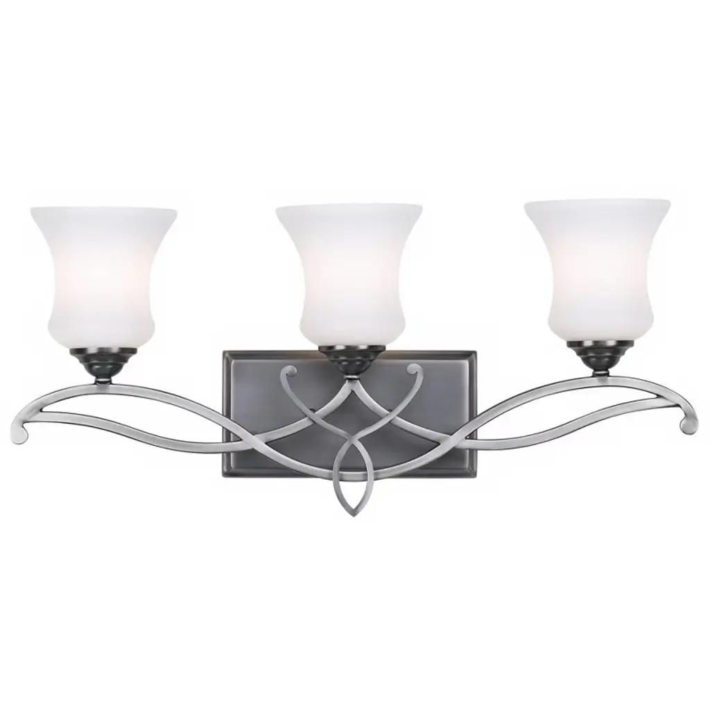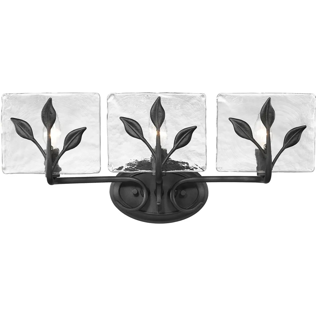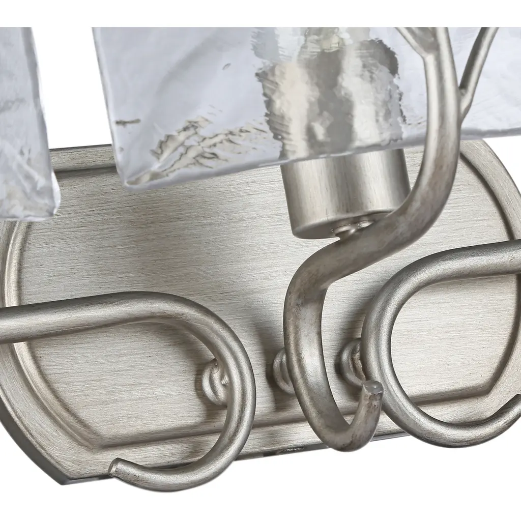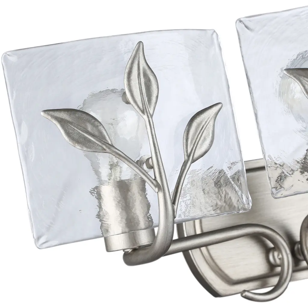 Bring nature-inspired elegance into your home with the Golden Lighting Calla 3-light Vanity in Peruvian Silver. Featuring a hammered water glass shade and a Peruvian Silver frame, it creates a welcoming atmosphere. The hammered water glass shade offers a heavy, irregular texture that not only refracts light beautifully but also adds an artisanal touch to your decor. This unique finish, inspired by ancient handmade silver, brings a rustic charm with its muted tones and rich patina. Brighten up bathrooms with dedicated lighting that flatters while providing practical task illumination. Damp Location Rated, this fixture is suitable for covered and semi-enclosed spaces with occasional moisture, such as bathrooms and laundry rooms. It requires 3 E12 Candelabra base bulbs (not included) with a maximum wattage of 60 per bulb. Overall dimensions are 21.75"W x 8.38"H x 7"D. Close with lifestyle appeal, this vanity light combines quality craftsmanship and elegant design for an exquisite addition to your home.
