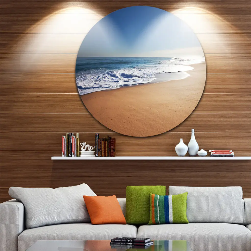Bring Contemporary Abstraction to your home with this large Circle Metal wall art. This Calm Blue Seashore with White Sun Metal Artwork makes it the focal point of any room or office. - White Gloss Coating ensures colors are extra vibrant with light reflection.- Aluminum grade Sheet Metal with 1 inch mounting frame on the back giving the illusion that the artwork is floating on the wall..- Mounting Brackets are included along with instructions.- High Quality Digital images are created directly into a glossy aluminum panel producing a stunning and captivating print into the glossy finish of the metal.- Water, Fire and Scratch resistant HD Aluminum panels.- Looks better than any photo paper and guaranteed to last at least 20 years- Easy to clean with a microfiber cloth. Colors are far superior to regular Canvas Art. - Easy to Hang