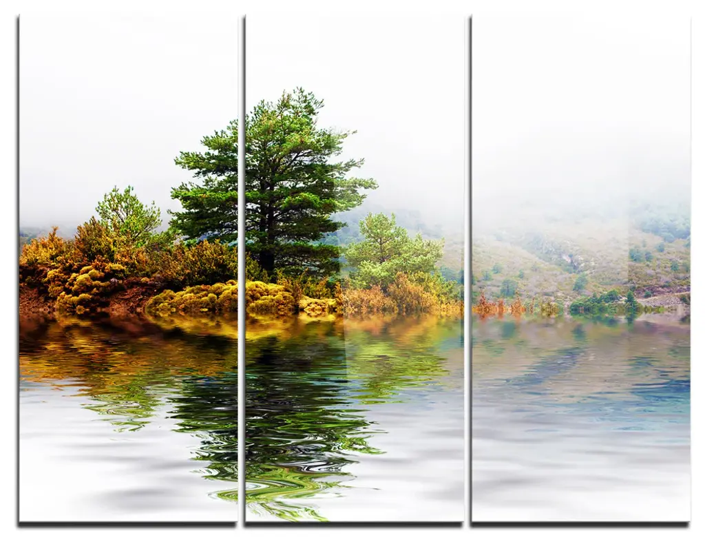 Calm Lake And Tree At Dawn Metal Print Wall Art, 3 Panel Split, Triptych, 72x36