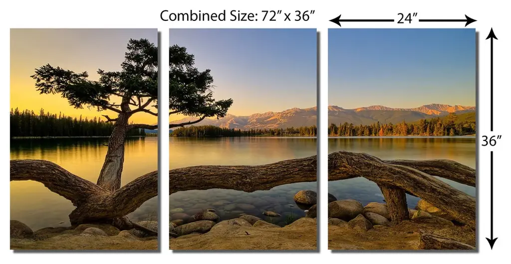 72"œ x 36"œ total size. Ready To Hang! (3 pieces - 24"œ x 36"œ each). 3 Panel Split (Triptych) Metal Print ft. Calm Lake + Tree at Dawn. Modern metal wall art for home or office wall decor & interior design. Printed on Luxurious, HD aluminum glossy metal panels. Multi panel art.. HD aluminum panels. Metal print wall art. Includes Shadow Wall Mount on the back.• Aluminum Metal Wall Art• Made in USA• Ready to hang - No assembly required• Shadow mount hardware on the back• 0.045"œ thick HD Aluminum Panels• Scratch resistant, glossy finish• Superb color clarity, luxurious prints• Epson printing process• For indoor or moisture rich environment use• Easy to clean. Gently wipe with microfiber cloth.