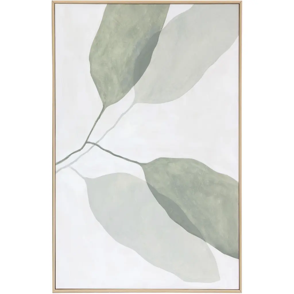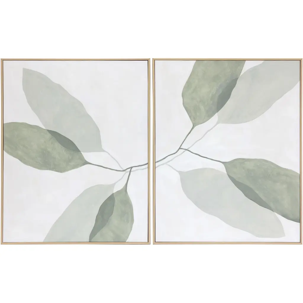 Freshen up any room with the cool green hues featured in this diptych painting. This piece features an image of hand-painted leaves that evoke a sense of nature and calmness. Features a natural wood floater frame that complements the artwork. Each artwork is hand-painted and will feature slight variations that make every piece unique.