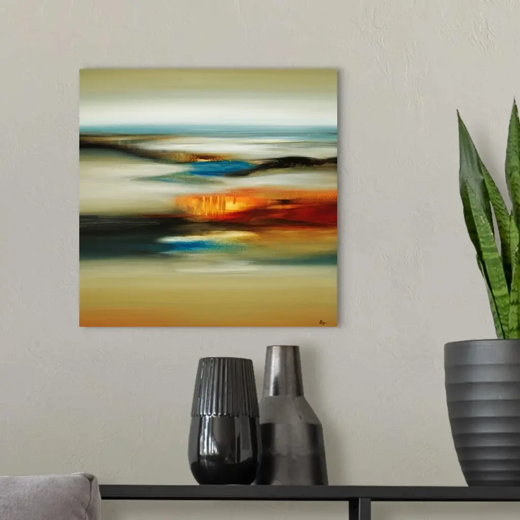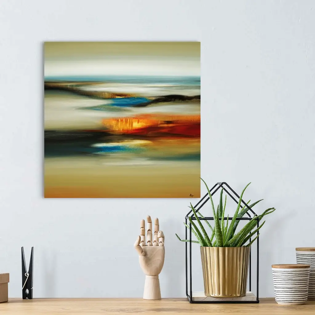 Contemporary abstract painting of landscape below covered by fog and mist.