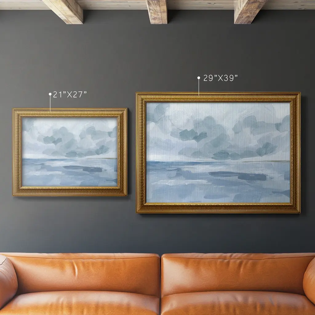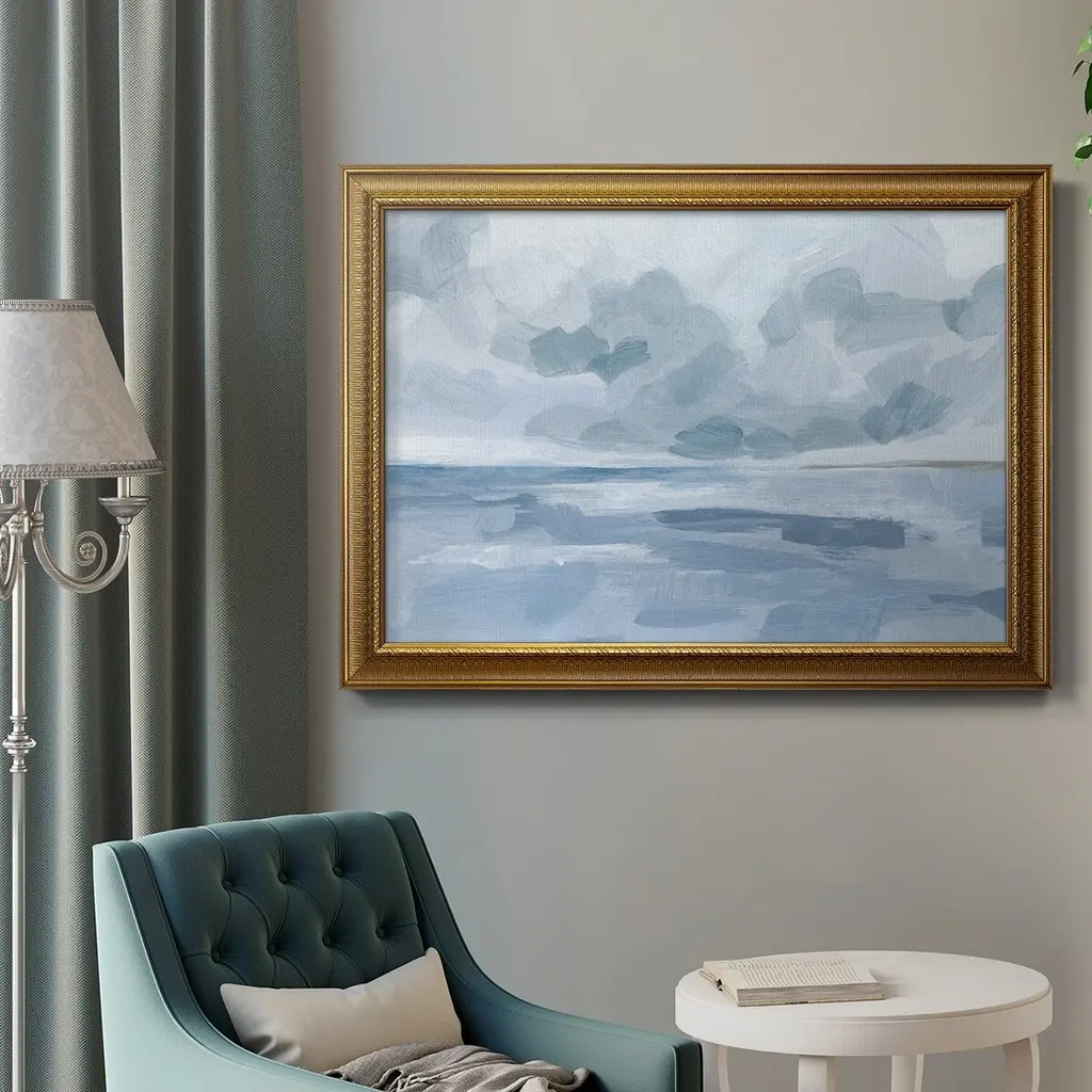 Calm Seascape II Premium Framed Canvas- Ready to Hang A Premium Framed Canvas created to last. Framed in distressed wood and available in an array of sizes and colors Featuring a beveled a solid wood stretcher bar, each piece comes ready to hand 3 SIZES AVAILABLE 16''X20'' - Overall Size 18'X27'' - Overall Size 24''x36'' - Overall Size Each piece is made to order. Each piece comes with hanging hardware. Made in the USA Ready to Hang Giclee Paper Print Acrylic Glass Beveled Matt Board