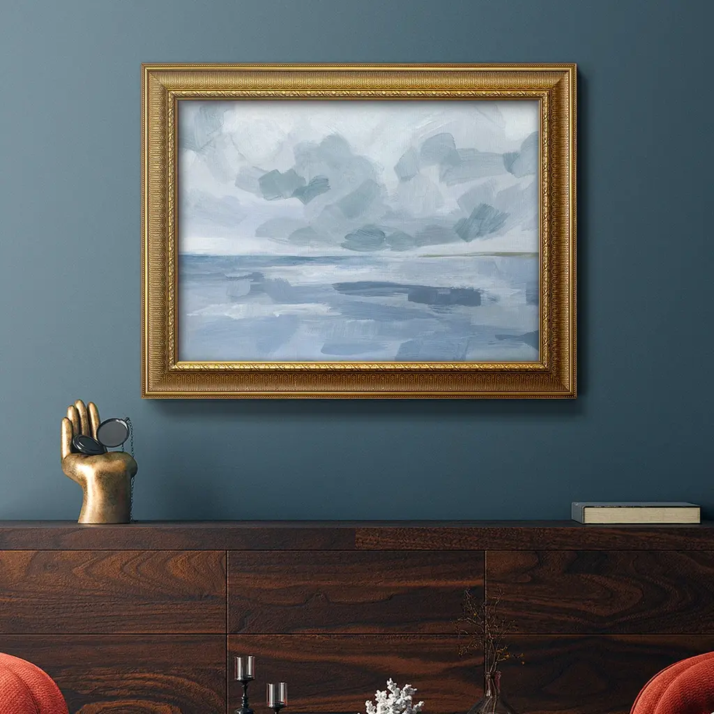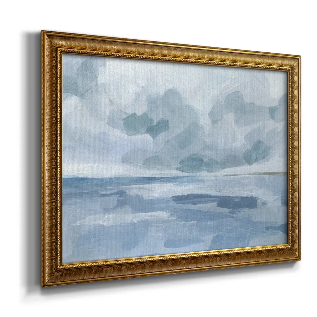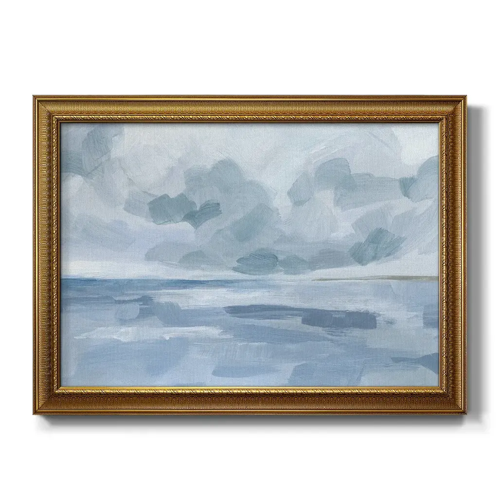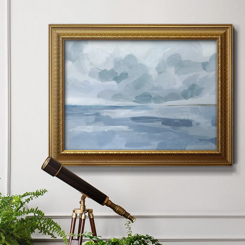 Calm Seascape II Premium Framed Canvas- Ready to Hang A Premium Framed Canvas created to last. Framed in distressed wood and available in an array of sizes and colors Featuring a beveled a solid wood stretcher bar, each piece comes ready to hand 3 SIZES AVAILABLE 16''X20'' - Overall Size 18'X27'' - Overall Size 24''x36'' - Overall Size Each piece is made to order. Each piece comes with hanging hardware. Made in the USA Ready to Hang Giclee Paper Print Acrylic Glass Beveled Matt Board
