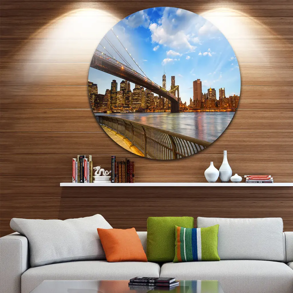 Calm Sky Over Brooklyn Bridge, Cityscape Photo Disc Metal Artwork, 23"