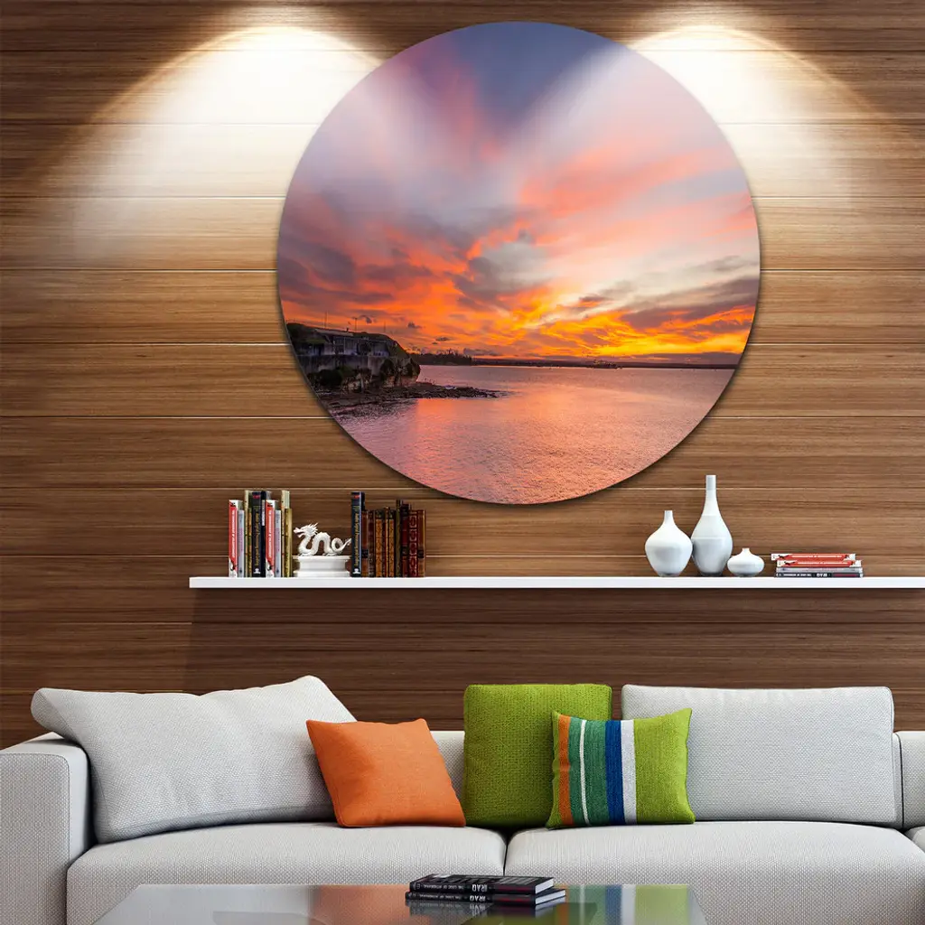 Bring Contemporary Abstraction to your home with this large Circle Metal wall art. This Calm Sydney Beach with Yellow Sky Metal Artwork makes it the focal point of any room or office. - White Gloss Coating ensures colors are extra vibrant with light reflection.- Aluminum grade Sheet Metal with 1 inch mounting frame on the back giving the illusion that the artwork is floating on the wall..- Mounting Brackets are included along with instructions.- High Quality Digital images are created directly into a glossy aluminum panel producing a stunning and captivating print into the glossy finish of the metal.- Water, Fire and Scratch resistant HD Aluminum panels.- Looks better than any photo paper and guaranteed to last at least 20 years- Easy to clean with a microfiber cloth. Colors are far superior to regular Canvas Art. - Easy to Hang