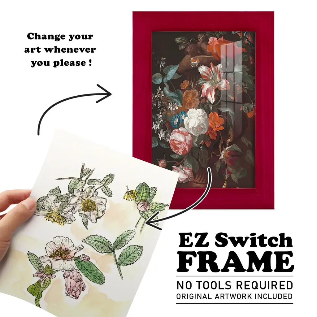 Camellia Study -EZ SWITCH Framed Print w/glass-Cherry Red A delightful, framed print. Featuring a solid wood frame with real wood glass. This premium print is giclee quality. In addition, every frame features a removable back and table top stand. This allows you to change your art in the future or to just stand the art on a table for a new look. We are sure you'll enjoy our new series of EZ SWITCH Framed Art. Solid Wood Frame Real Glass Removable / Replaceable Art Built in Tabletop Stand Sizes range from 4x6 up to 12x15 - buy just one or pair them up as sets as you see fit.