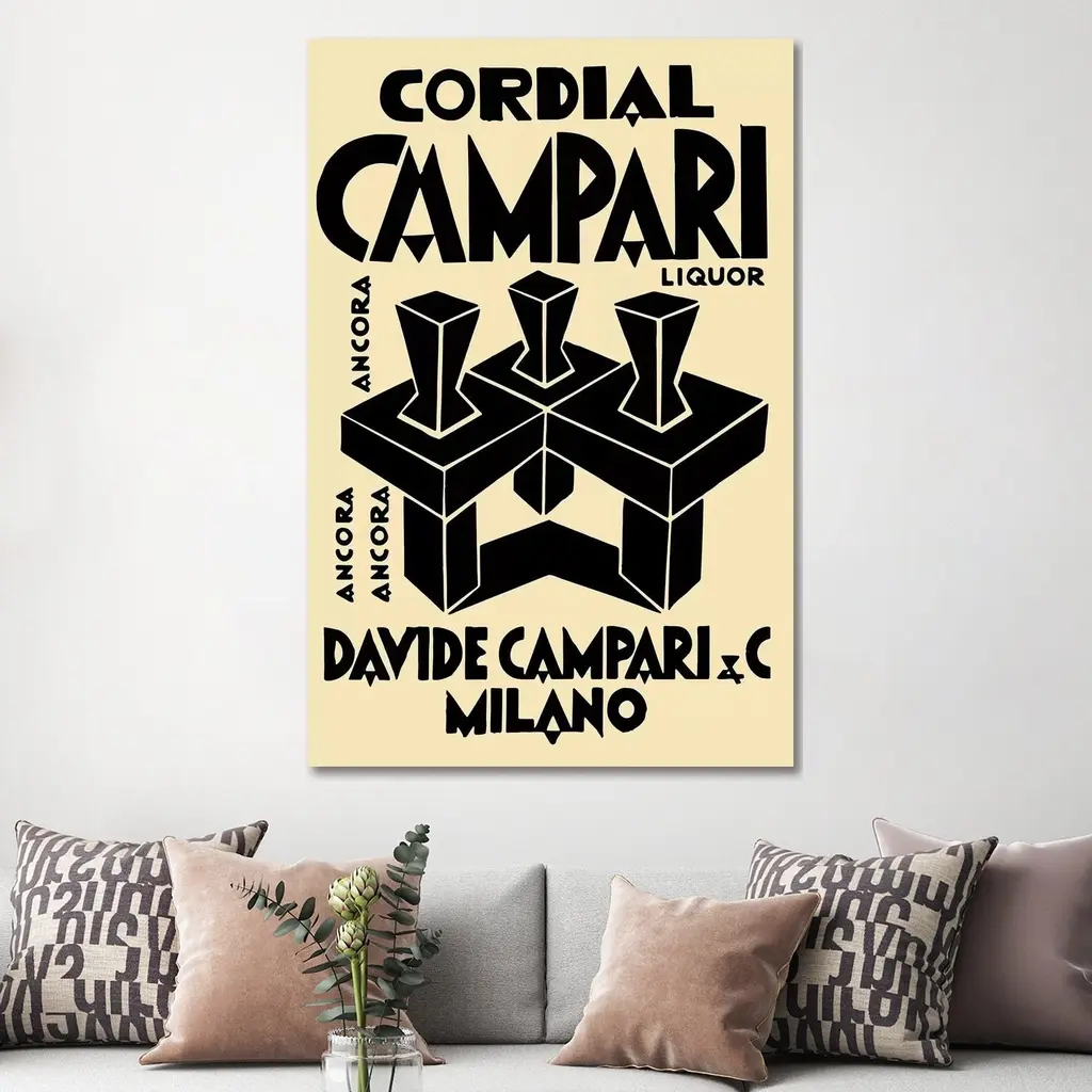 Campari Soda by Giovanni Mingozzi 1950 on linen excellent Carlo Mingozzi’s 1950 Campari Soda poster highlights the brand’s distinctive bottle, originally designed by Futurist artist Fortunato Depero in 1932. As the world’s first pre-mixed alcoholic beverage, Campari Soda came in a unique, single-serve bottle shaped like an inverted goblet. Mingozzi’s design emphasizes this form by placing the bottle next to a matching glass, drawing attention to their triangular shapes. The minimalist composition follows the Object Poster style, which focuses solely on the product without additional slogans. A subtle gray border echoes the bottle’s design, reinforcing its visual impact. Mingozzi’s work blends artistic simplicity with effective advertising, making it a memorable example of mid-century poster design. Artist: Mingozzi, Giovanni Printer: Studio Mingozzi, Bologna Size: 27.5 x 39" / 70 x 100 cm On/Off Linen: On Linen Print Technique: lithograph Year: 1950 Condition & Comments: Excellent
