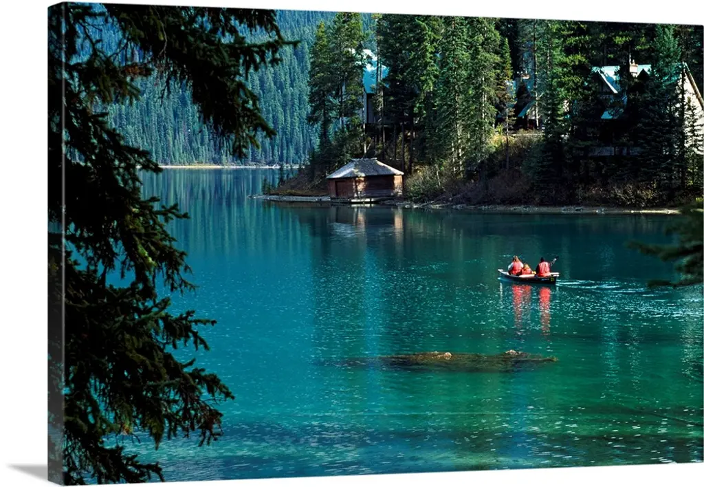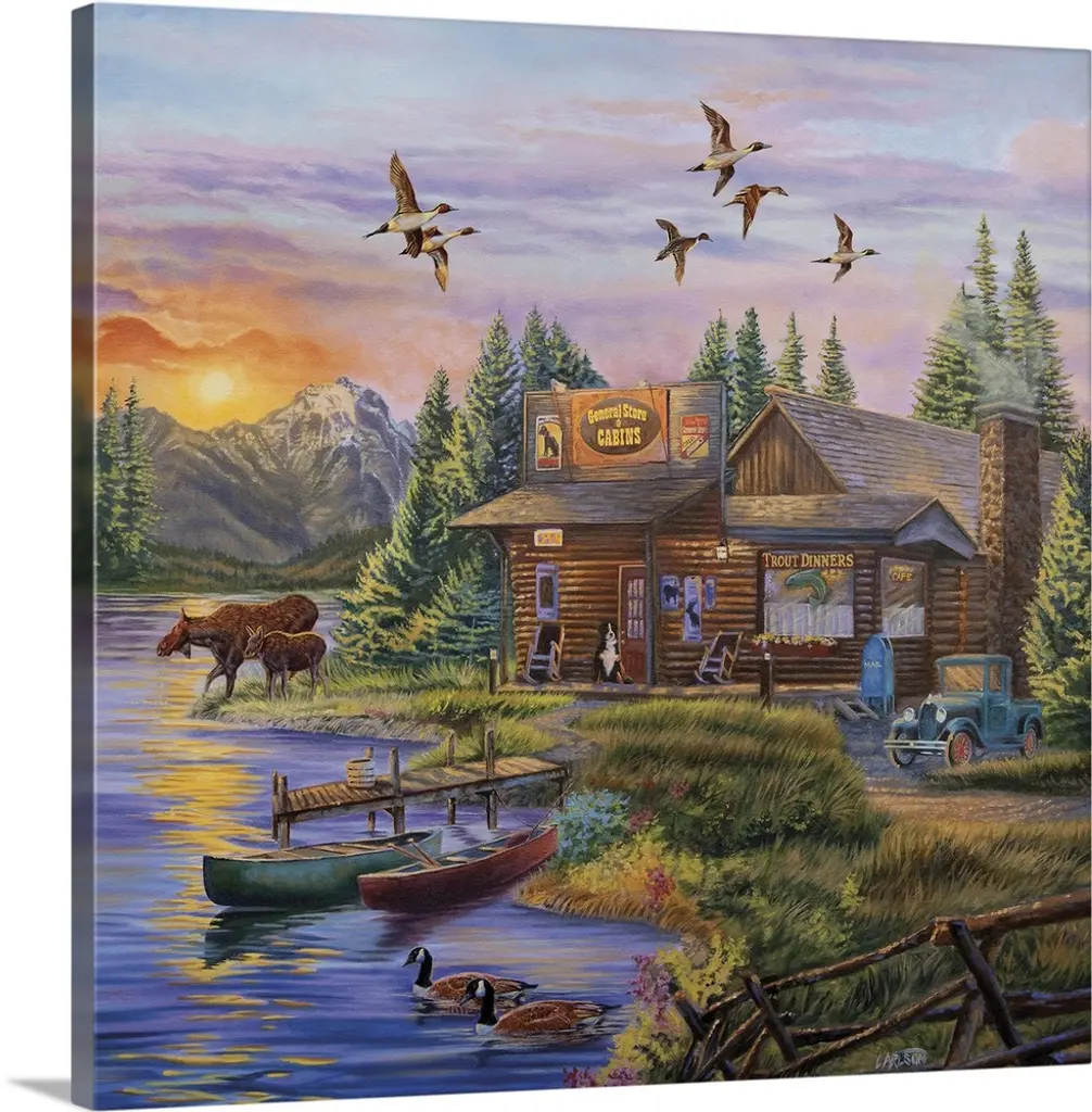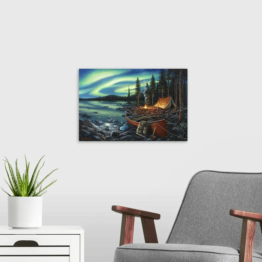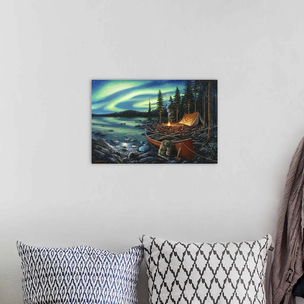 Contemporary painting of a campsite with a fire and a canoe underneath the Northern Lights.