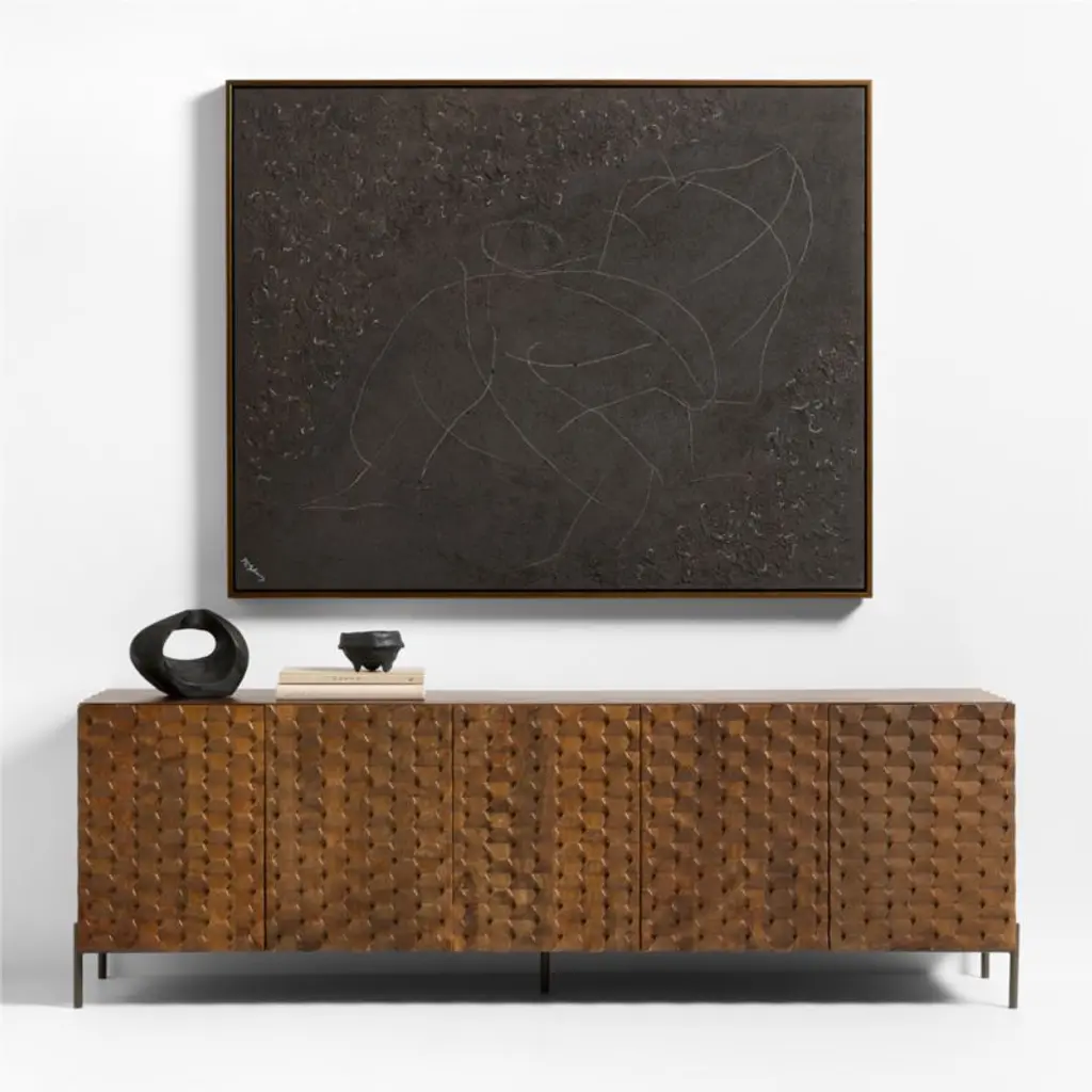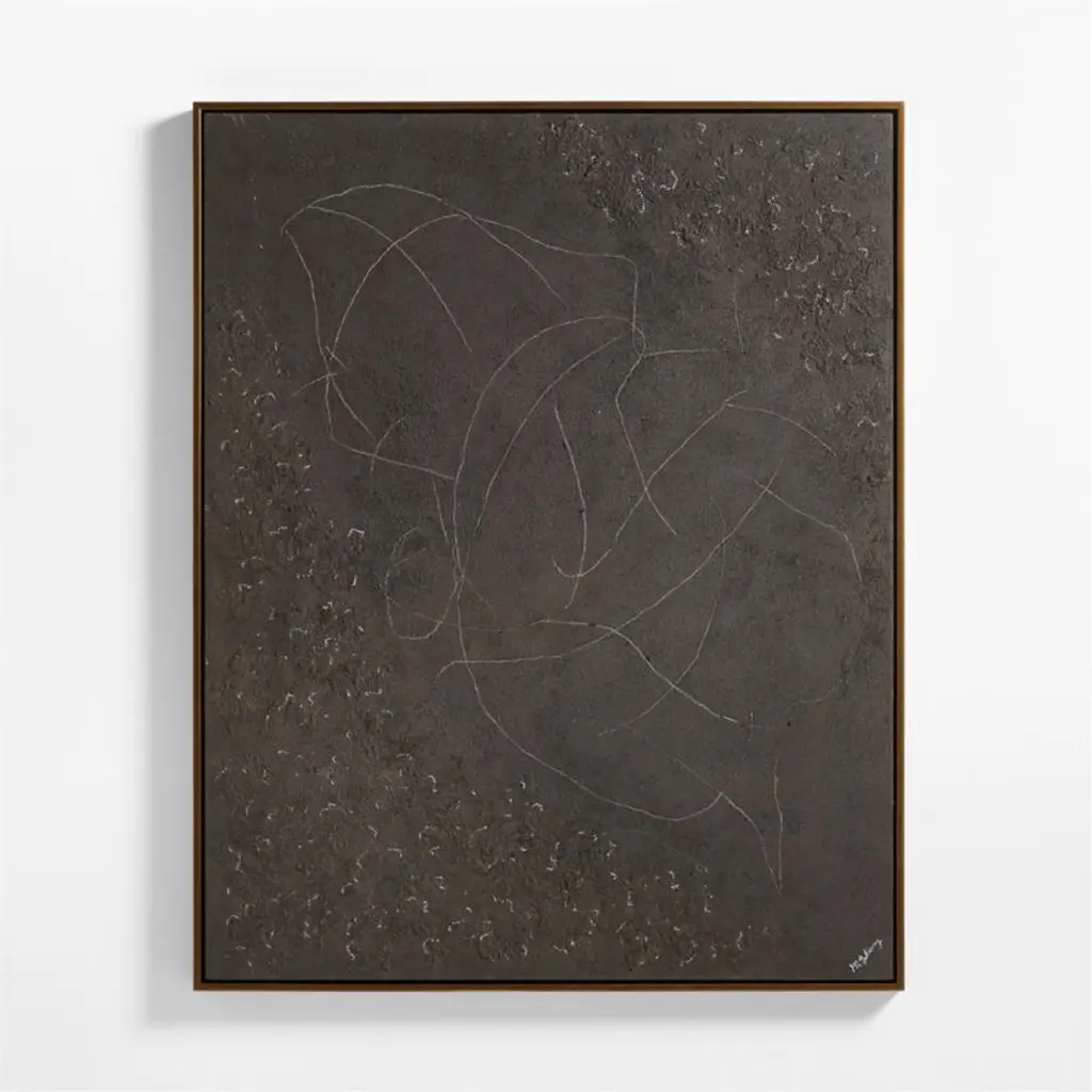 Inspired by the rugged terrain of a cooled lava flow, Marcela Gutierrez creates a textured landscape using papier mache, soil and paint to give this monochromatic painting its dramatic intensity. Based on the original mixed-media composition, each one-of-a-kind work or art is crafted by hand with a mix of paper pulp, sand gel and acrylic paint. A wood frame wrapped in antique bronze complements for a gallery-worthy presentation.