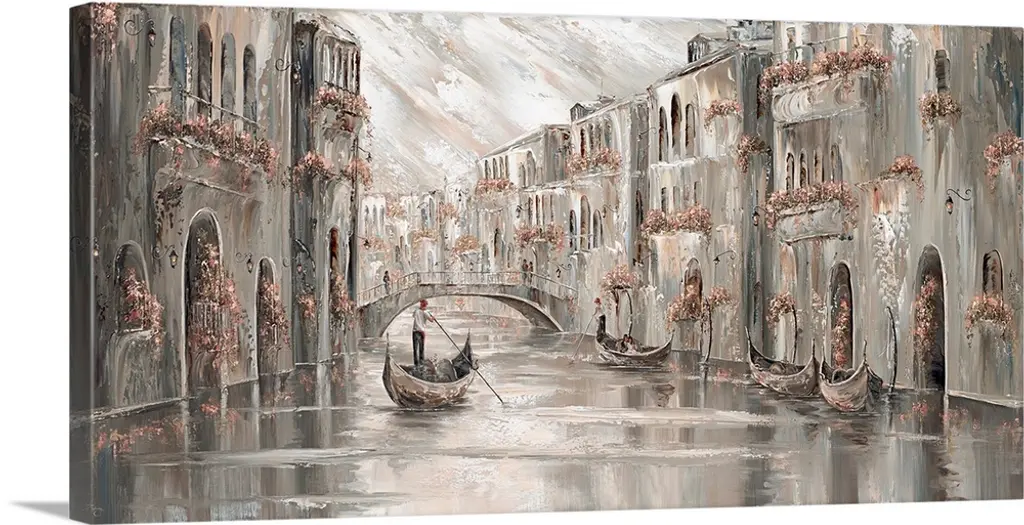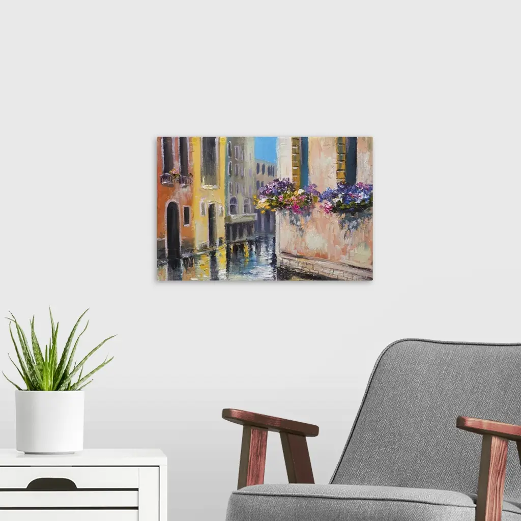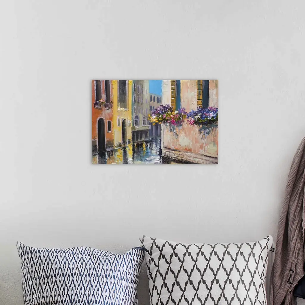 Originally an oil painting of a canal in Venice, Italy. Famous tourist place, colorful impressionism.