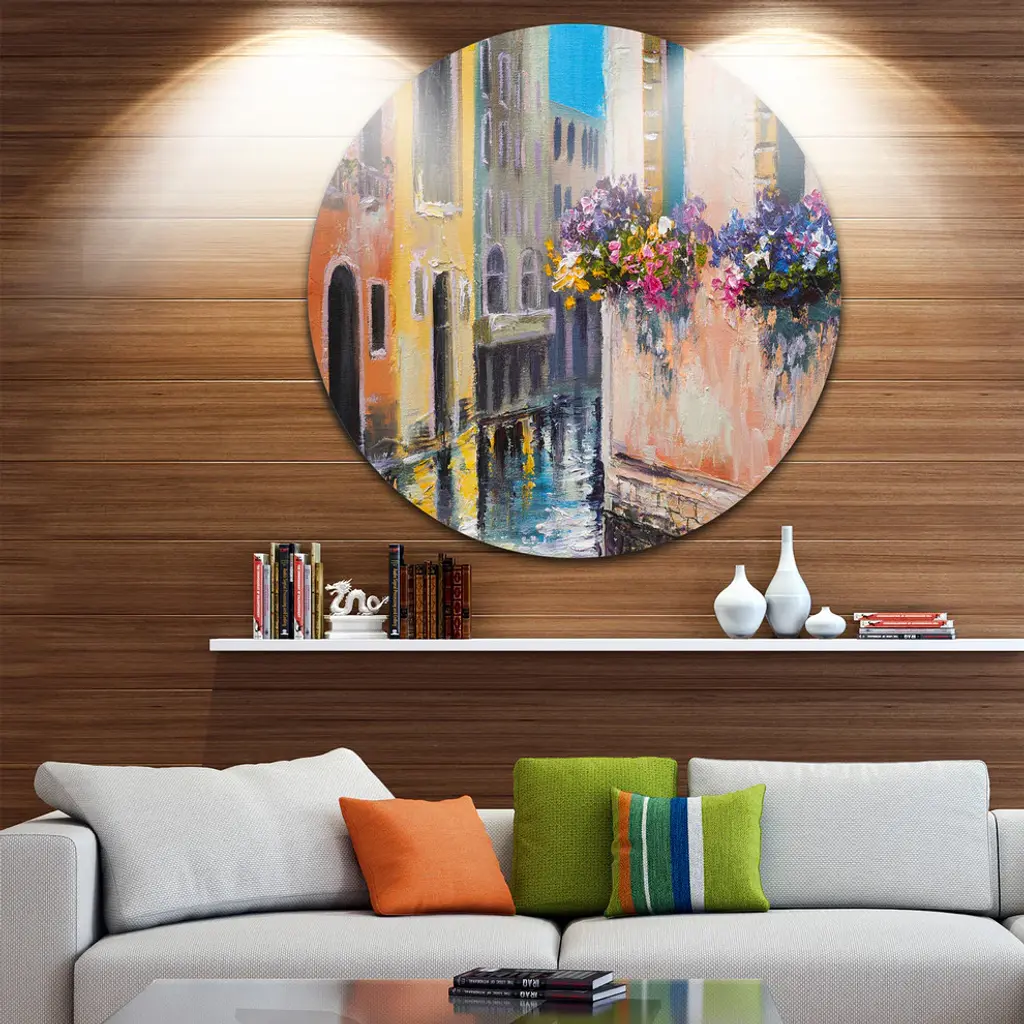 Canal In Venice With Flowers, Cityscape Large Disc Metal Wall Art, 23"