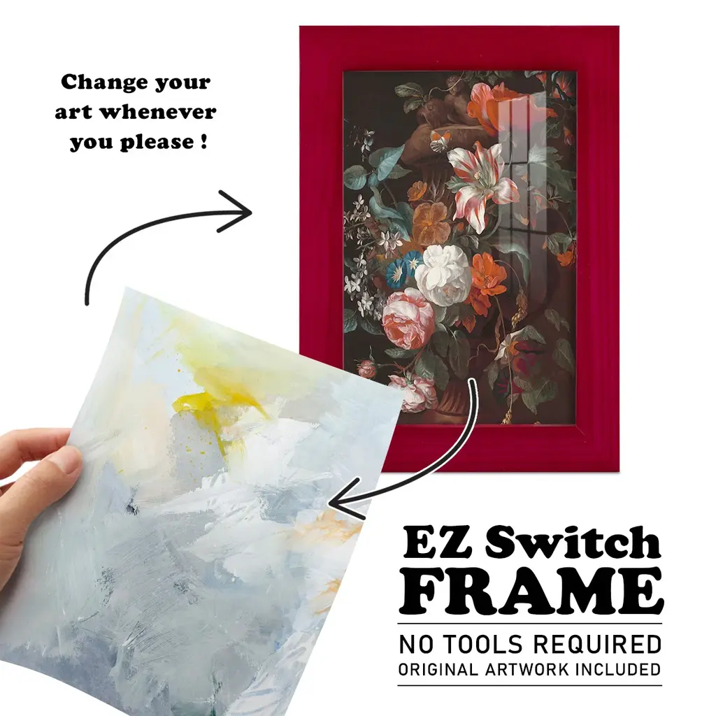 Canary and Sky II -EZ SWITCH Framed Print w/glass-Cherry Red A delightful, framed print. Featuring a solid wood frame with real wood glass. This premium print is giclee quality. In addition, every frame features a removable back and table top stand. This allows you to change your art in the future or to just stand the art on a table for a new look. We are sure you'll enjoy our new series of EZ SWITCH Framed Art. Solid Wood Frame Real Glass Removable / Replaceable Art Built in Tabletop Stand Sizes range from 4x6 up to 12x15 - buy just one or pair them up as sets as you see fit.