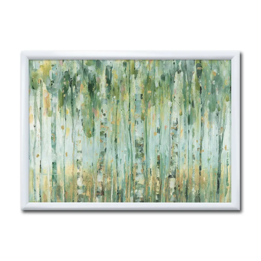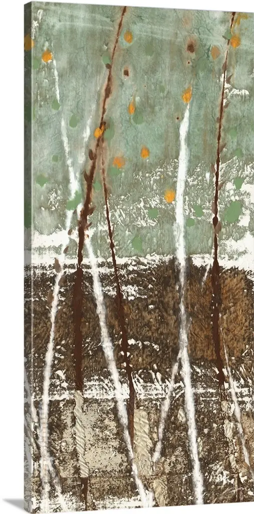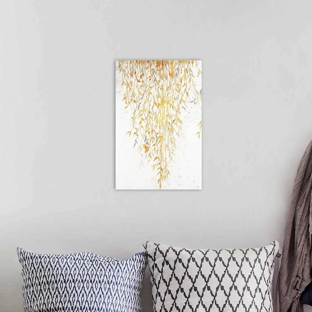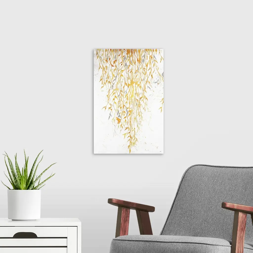 Contemporary painting of hanging golden leafy vines.
