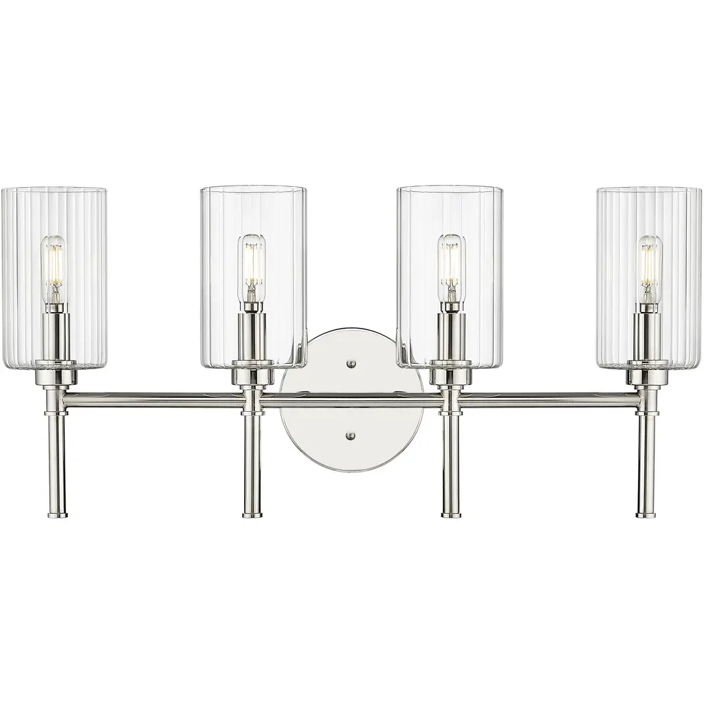 In the Geneva three light vanity fixture, slender, fluted shades form an elegant, dynamic silhouette that's balanced by a strong frame of Burnished Brass or Polished Nickel.