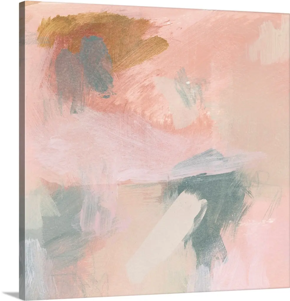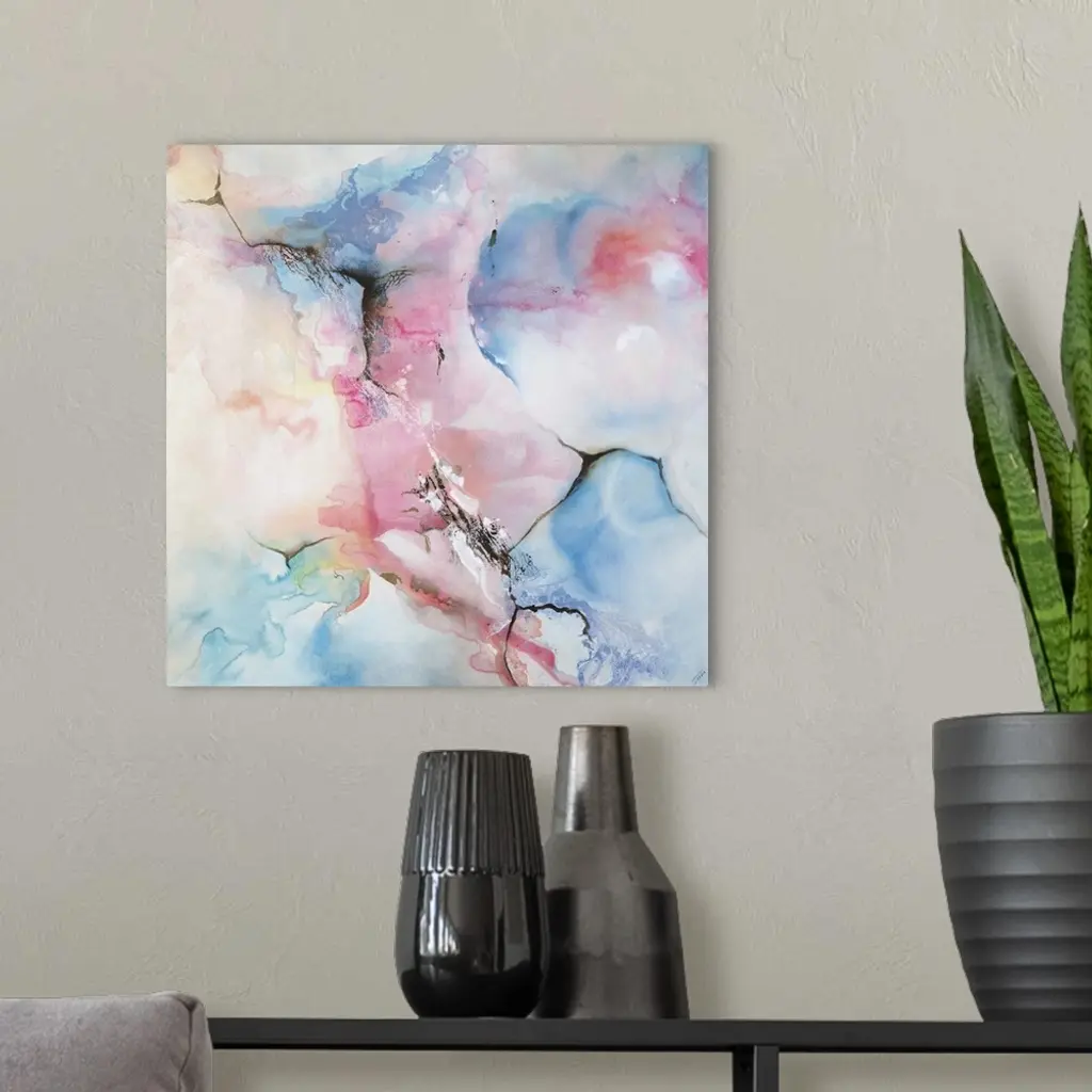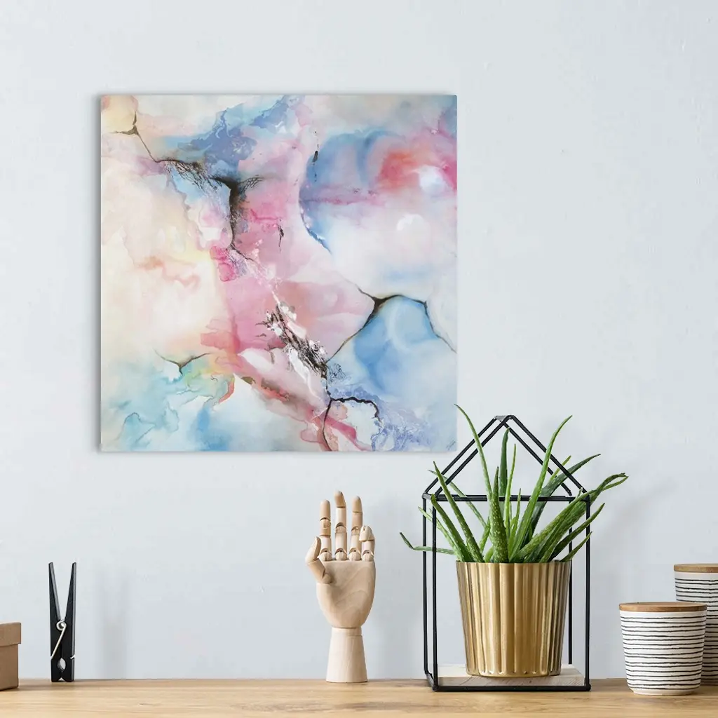 Square contemporary abstract painting with faded blue, pink, and yellow hues that appear like a watercolor painting, added pops of gold and black lines create contrast.