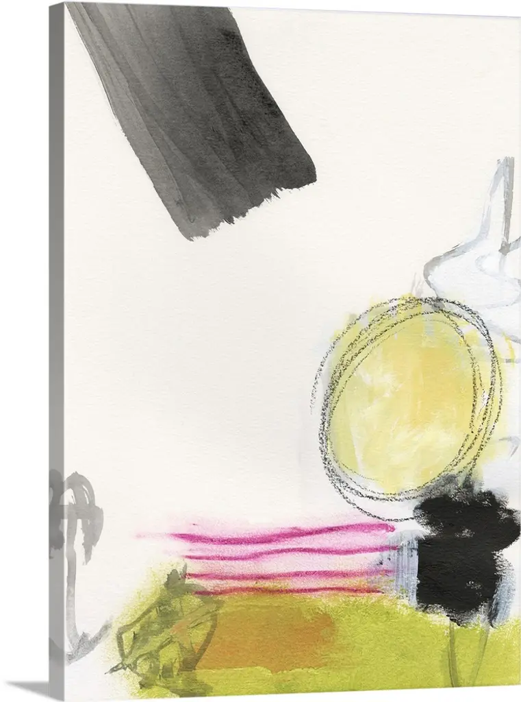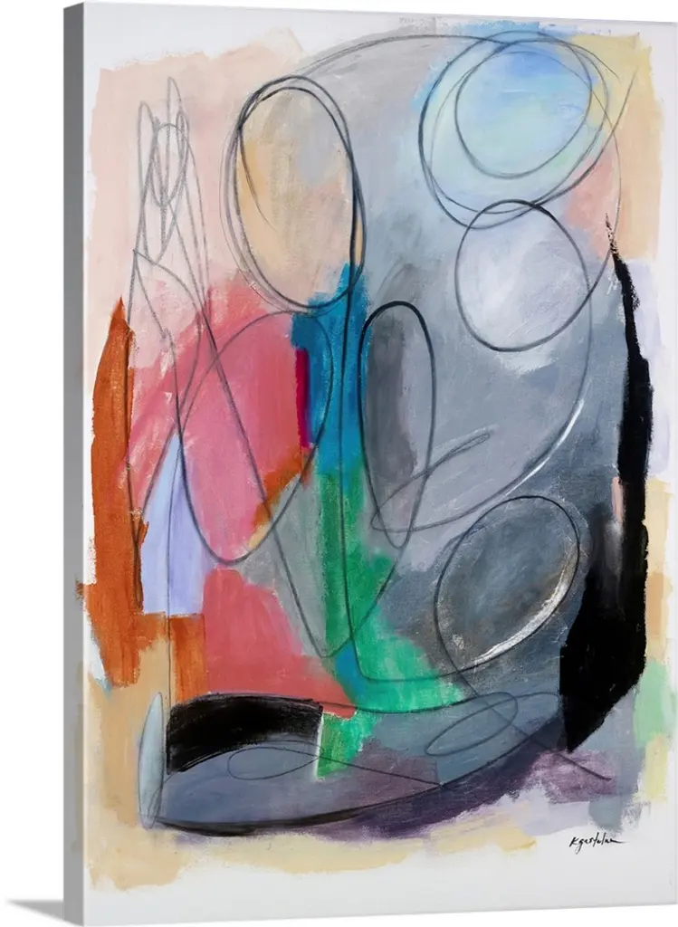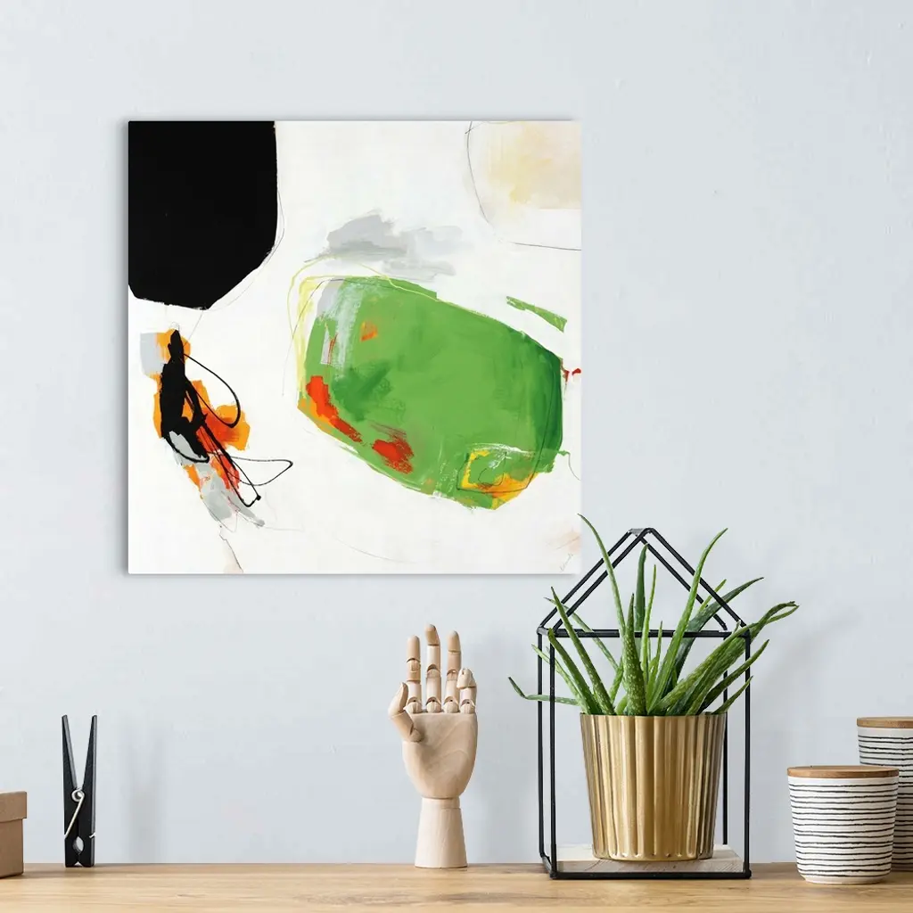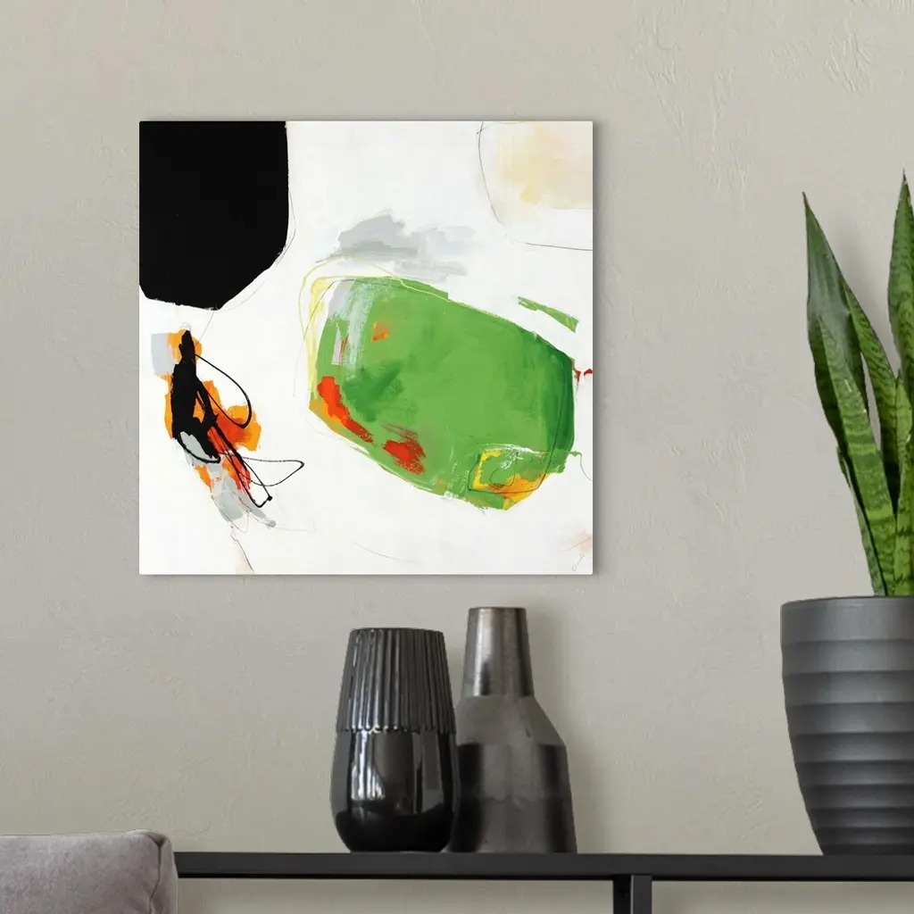 Abstract painting of several square and rectangular shapes in different colors and sizes, some with smaller shapes and lines overlapping, on a bright solid background.