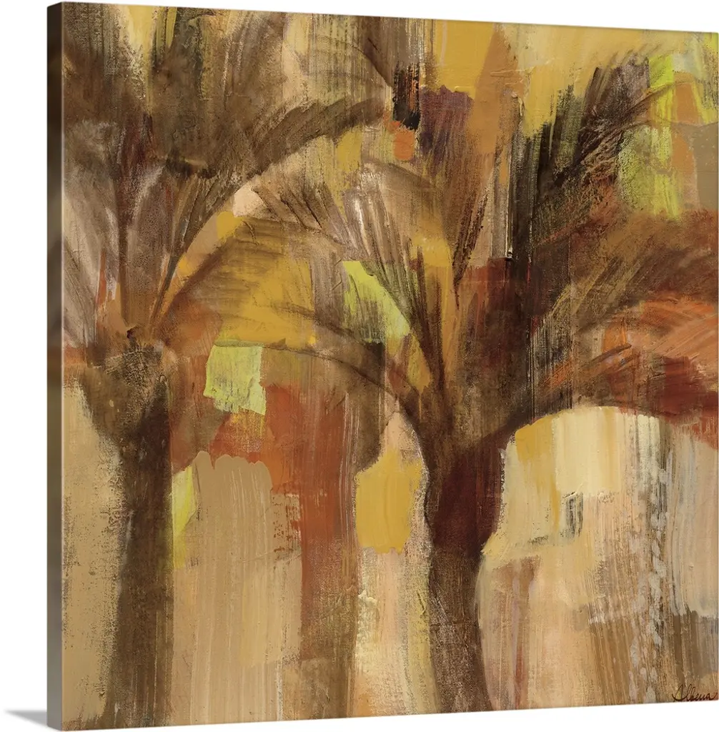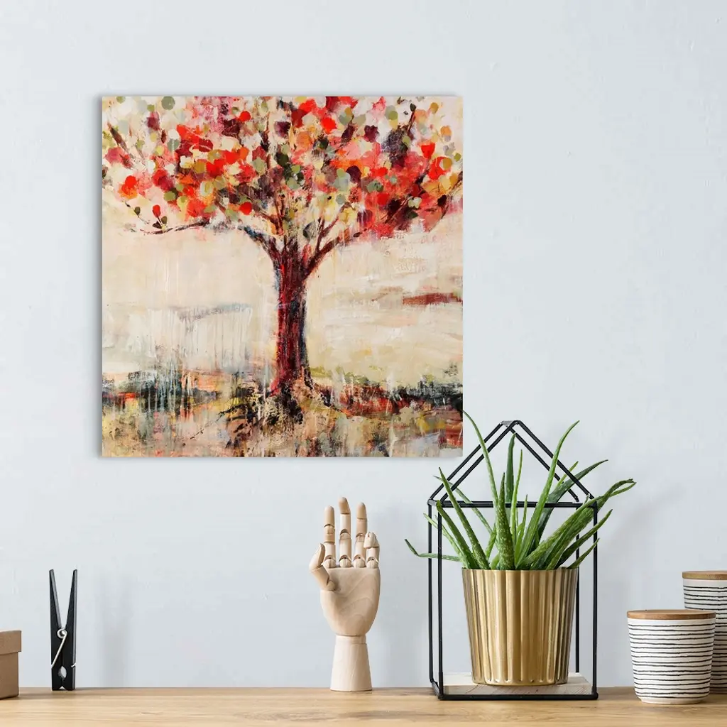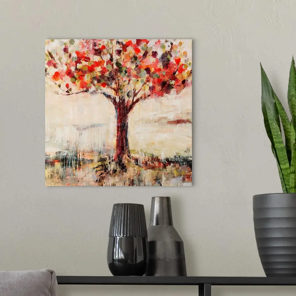 Abstract landscape painting feature a tree done in vibrant, candy-like colors.