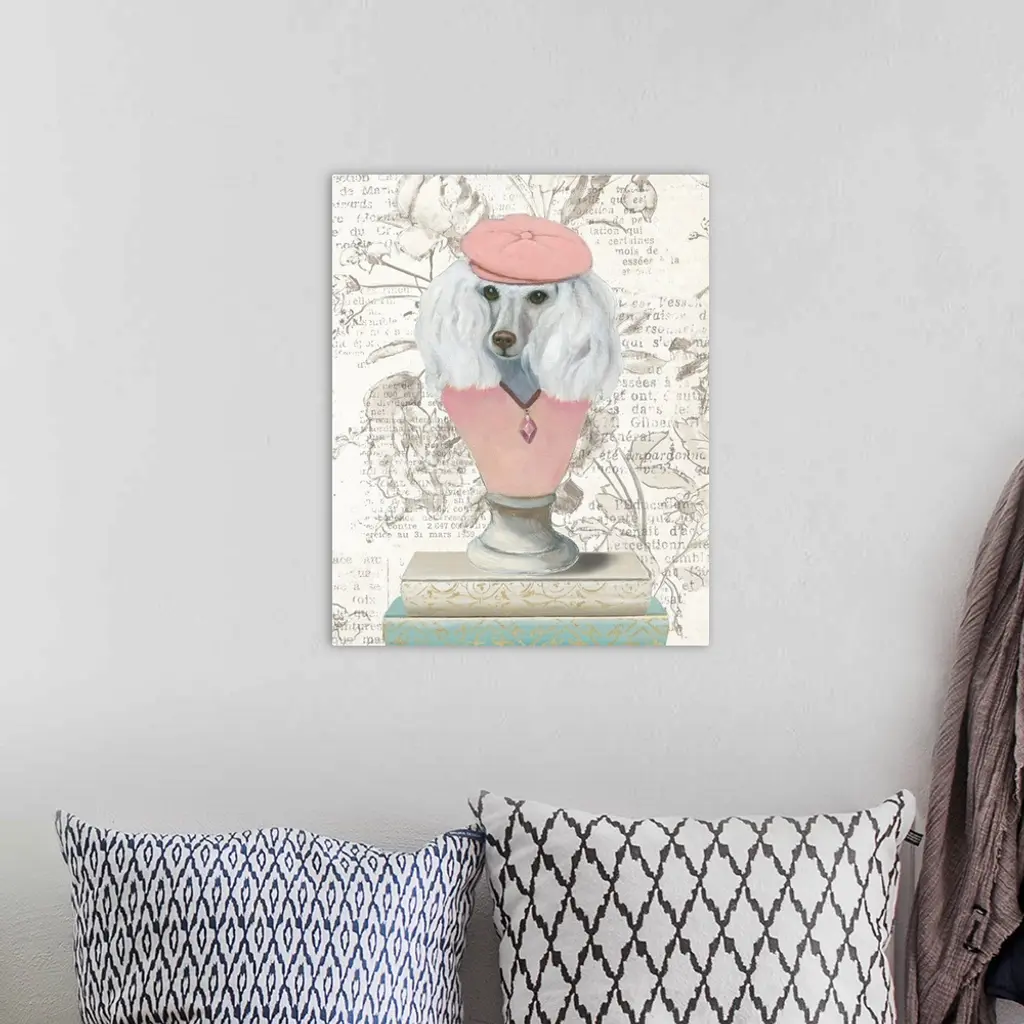 Humorous artwork of a bust of a poodle wearing a pink hat and sweater sitting on a stack of books against a floral letter print background.