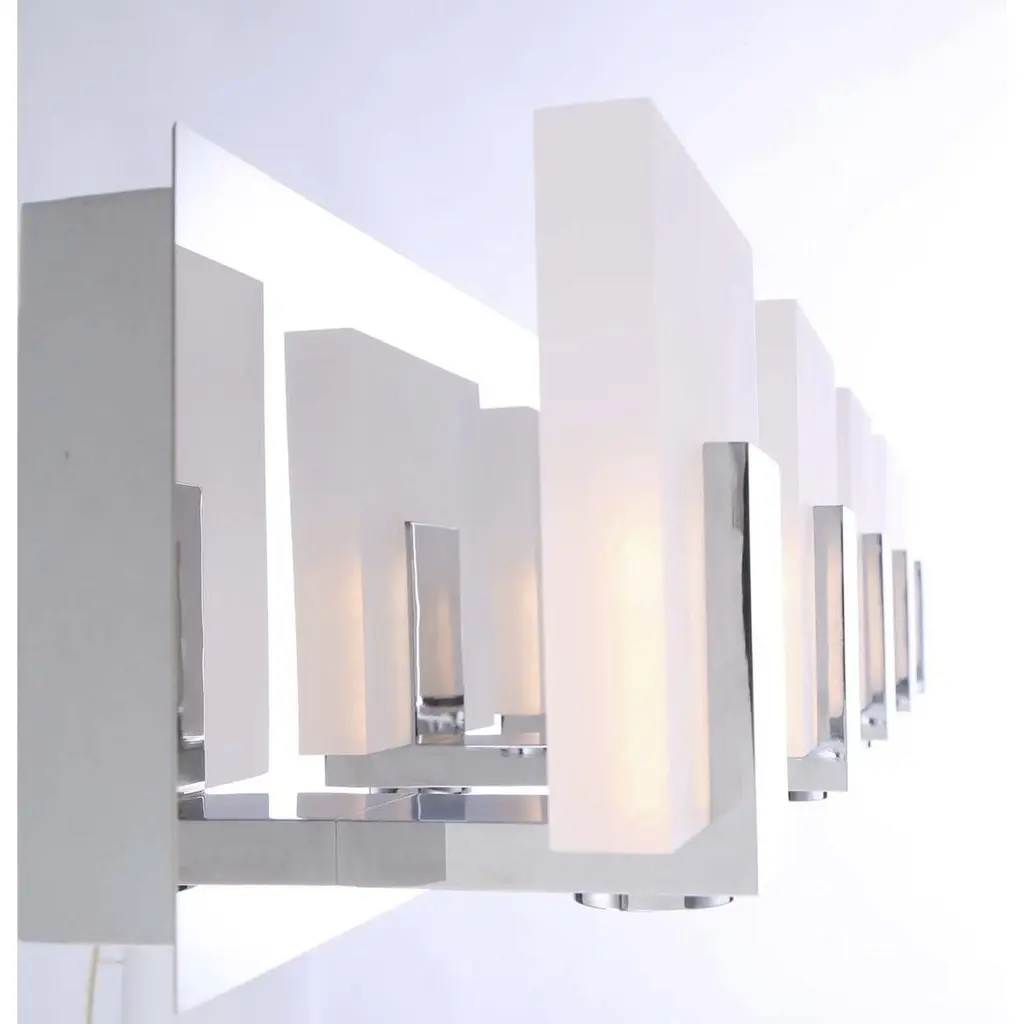 Illuminated acrylic diffusers are vertically seated on a chrome frame. The frosted acrylics provide a softened glow while the downlight offers a more concentrated beam.