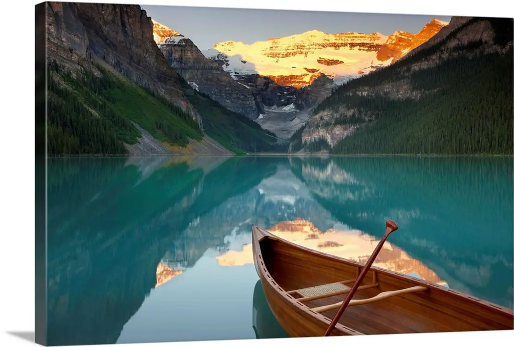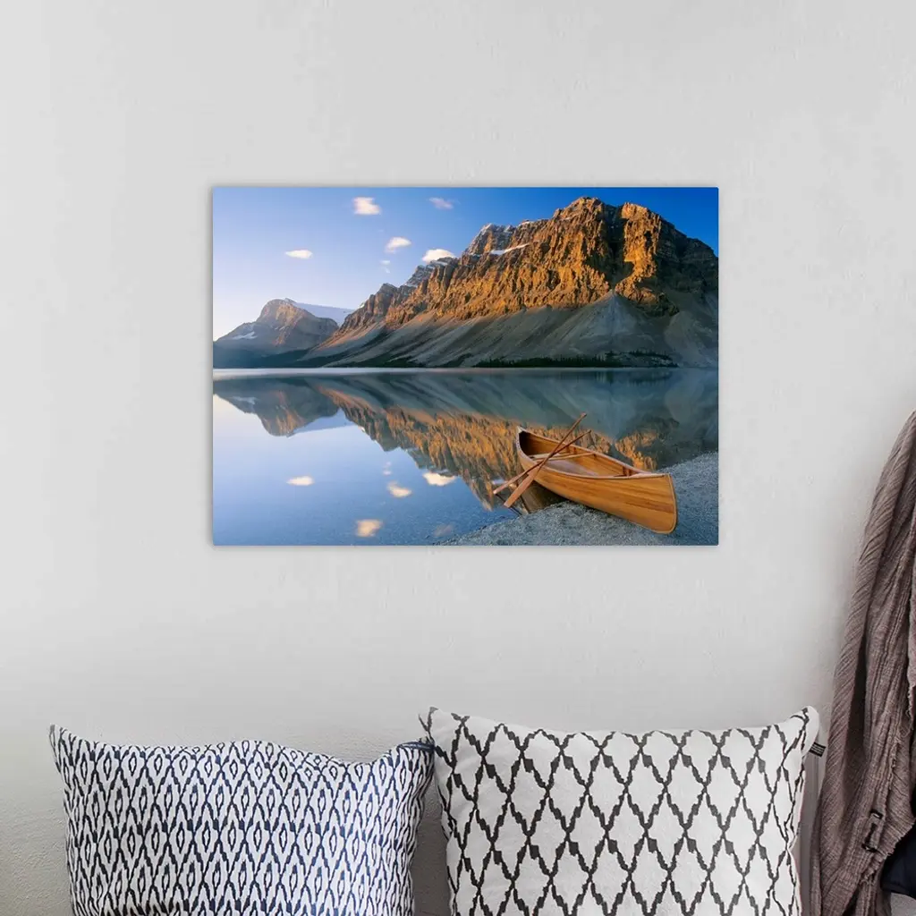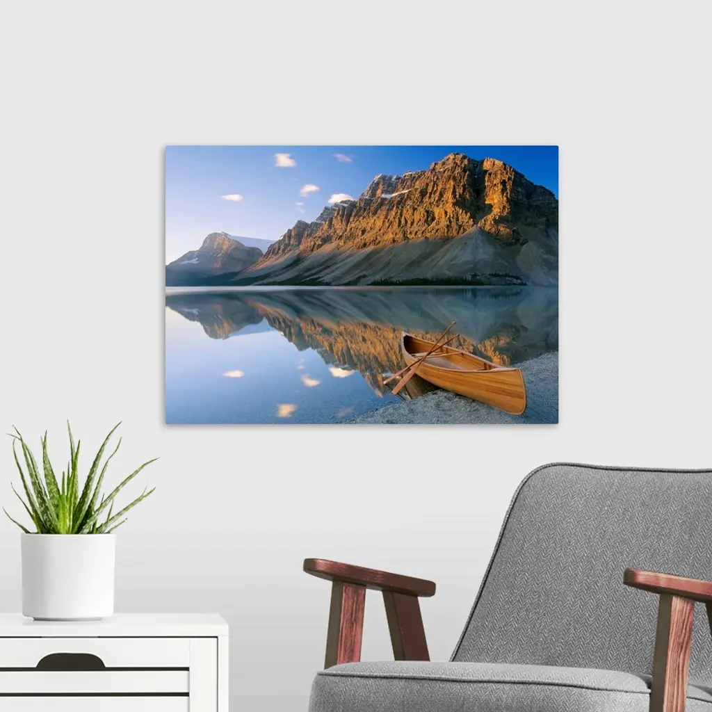 Oversized photography artwork of a canoe sitting on the edge of water with mountains in the background that reflect in the lake.
