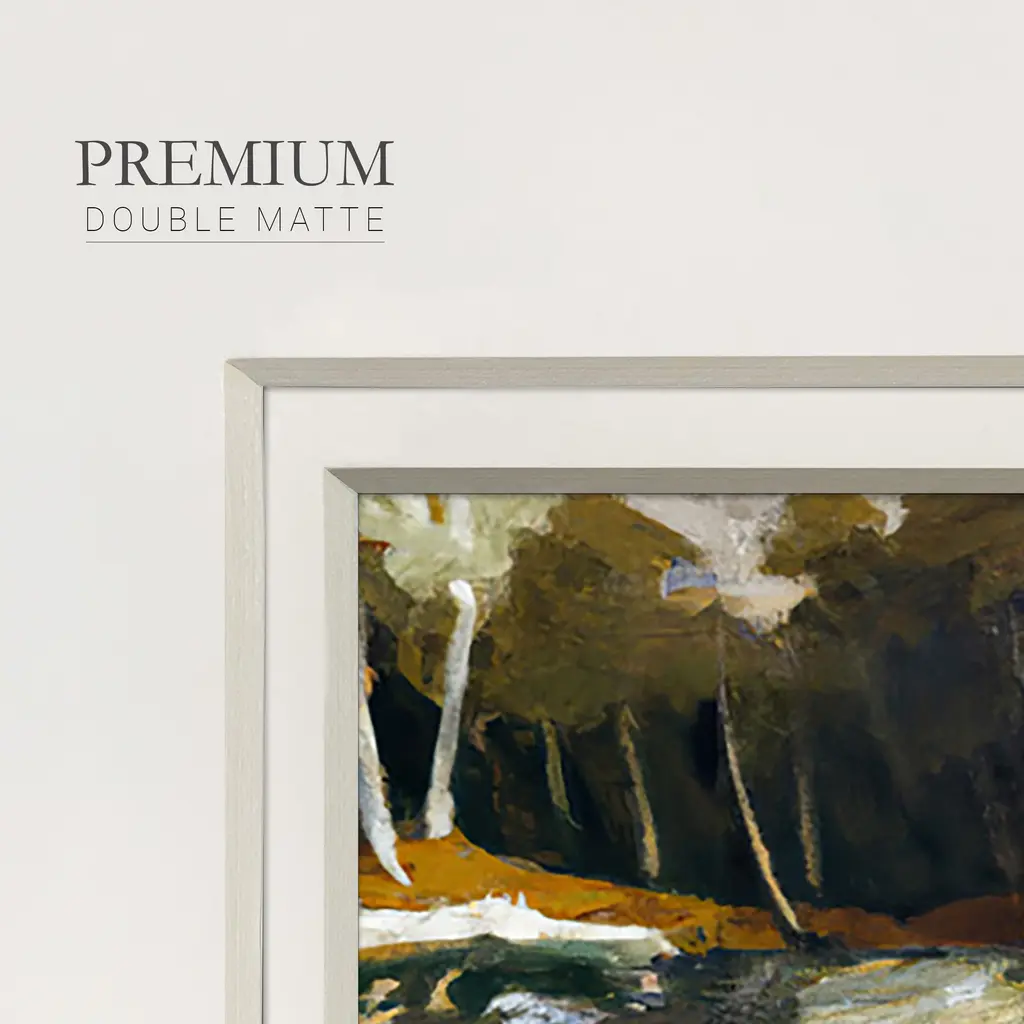 Canoe in the WoodsPremium Framed Print A framed cold pressed paper print featuring superior double matting and quality frame. 2 SIZES AVAILABLE 16''X16''' - Overall Size 20''X20''' - Overall Size Each piece is made to order. Each piece comes with hanging hardware. Made in the USA Ready to Hang Giclee Paper Print Plexiglass Beveled Matt Board Double Matte Board
