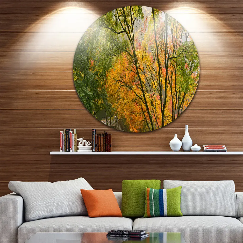 Bring Contemporary Abstraction to your home with this large Circle Metal wall art. This Canopy of Maple Trees in Fall Metal Artwork makes it the focal point of any room or office. - White Gloss Coating ensures colors are extra vibrant with light reflection.- Aluminum grade Sheet Metal with 1 inch mounting frame on the back giving the illusion that the artwork is floating on the wall..- Mounting Brackets are included along with instructions.- High Quality Digital images are created directly into a glossy aluminum panel producing a stunning and captivating print into the glossy finish of the metal.- Water, Fire and Scratch resistant HD Aluminum panels.- Looks better than any photo paper and guaranteed to last at least 20 years- Easy to clean with a microfiber cloth. Colors are far superior to regular Canvas Art. - Easy to Hang