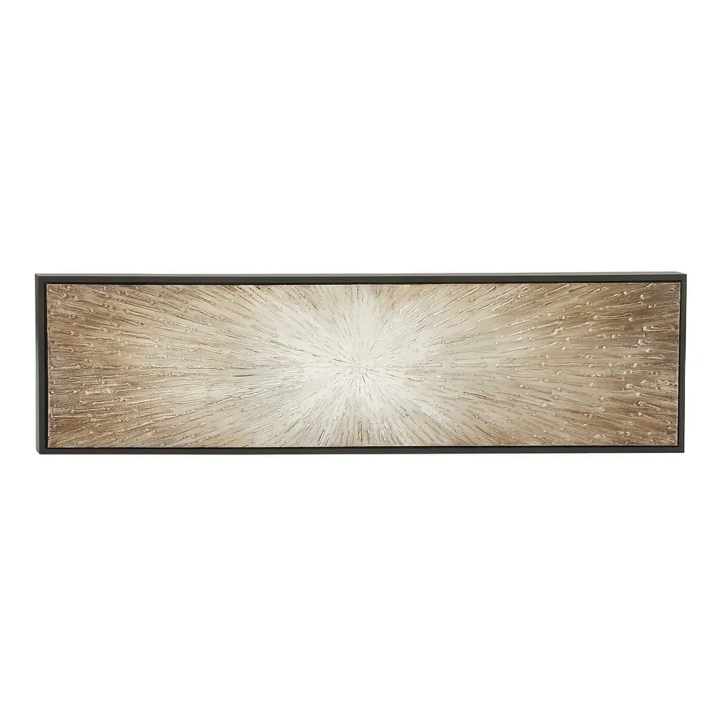 Elevate your home decor with this stunning Canvas Radial Starburst Framed Wall Art. The beautiful combination of light gold, dark gold, soft beige, creme, white, and metallic silver colors creates a mesmerizing sunburst design that adds a touch of luxury to any space. Made of polystone, wood, and canvas fabric materials, this thin rectangle-shaped wall art is perfect for modern and eclectic-themed living spaces. Hang it horizontally using the sawtooths on the back (nails and screws not included) to create a beautiful gallery wall. Indoor use only.Features: