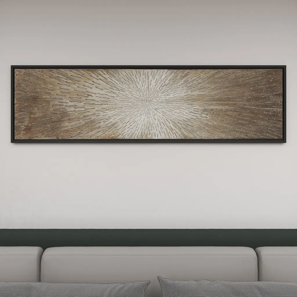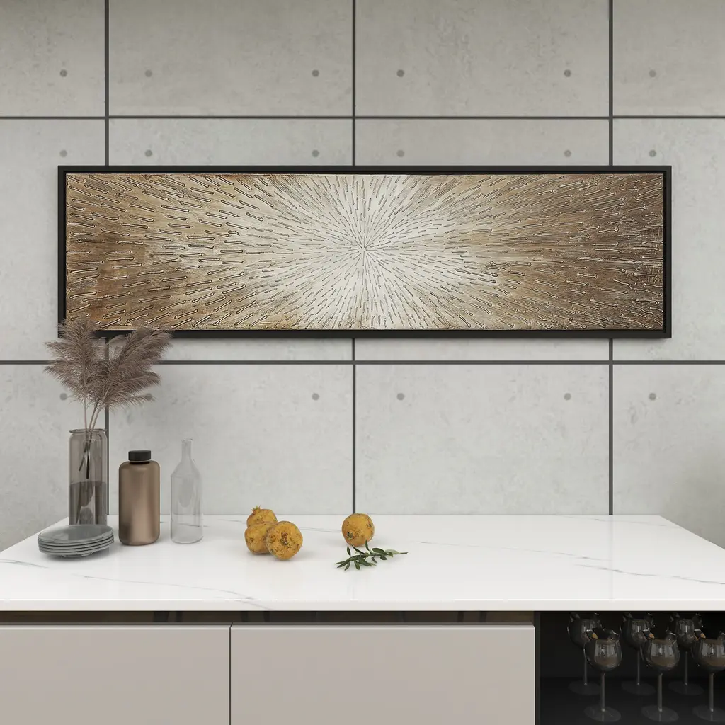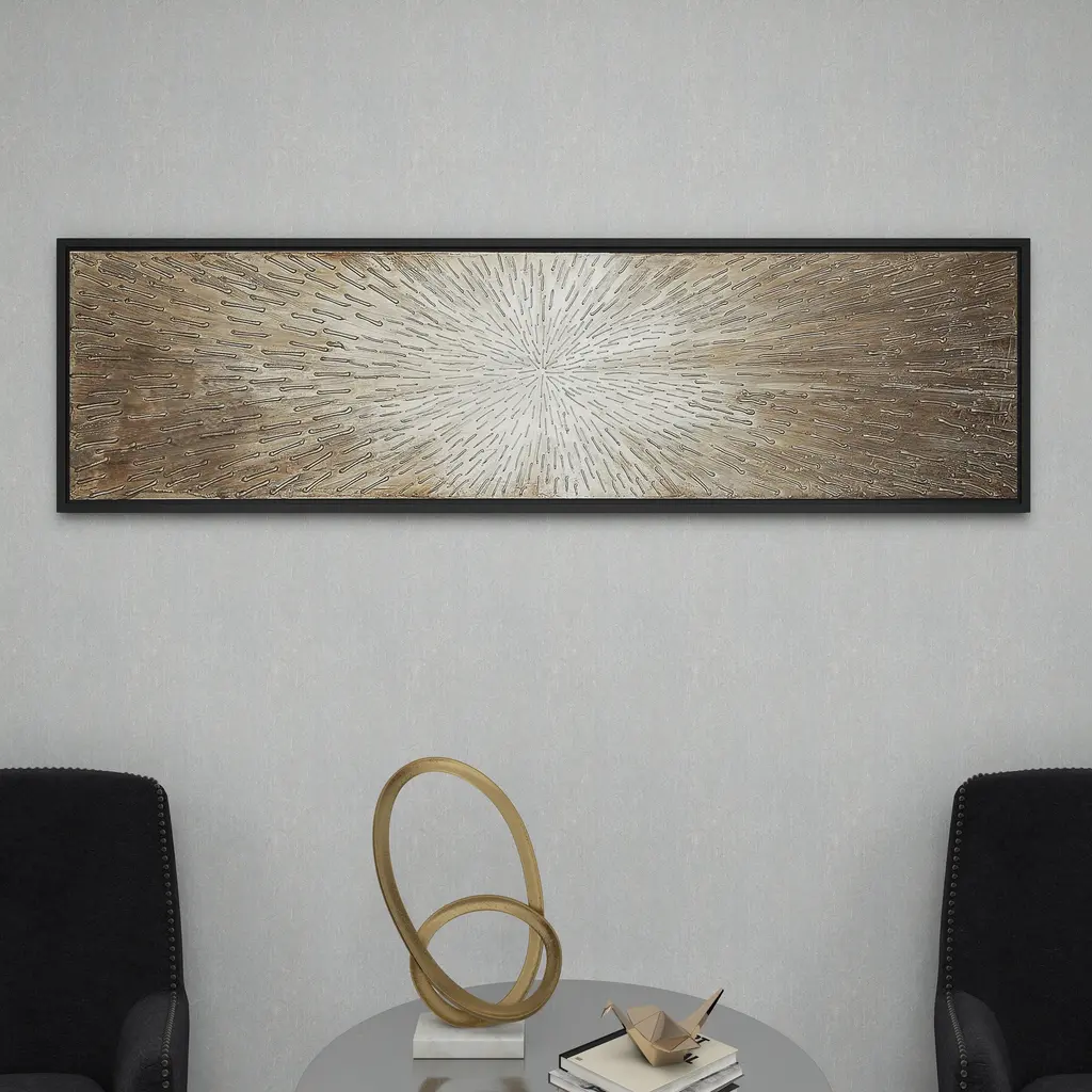 Elevate your home decor with this stunning Canvas Radial Starburst Framed Wall Art. The beautiful combination of light gold, dark gold, soft beige, creme, white, and metallic silver colors creates a mesmerizing sunburst design that adds a touch of luxury to any space. Made of polystone, wood, and canvas fabric materials, this thin rectangle-shaped wall art is perfect for modern and eclectic-themed living spaces. Hang it horizontally using the sawtooths on the back (nails and screws not included) to create a beautiful gallery wall. Indoor use only.Features: