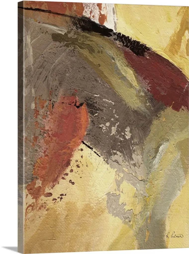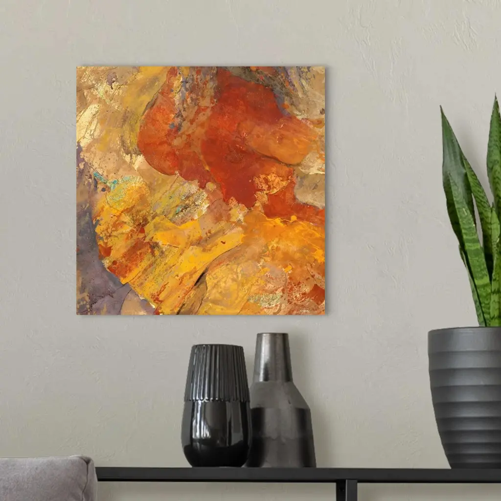 Square abstract painting with brown, orange, cream, and yellow hues resembling a canyon with small hints of blue paint splatter.