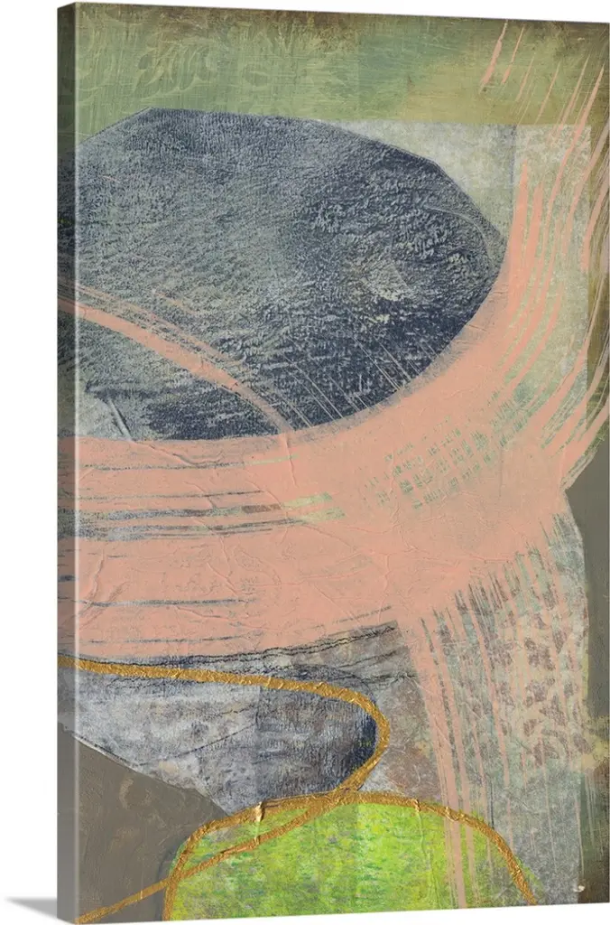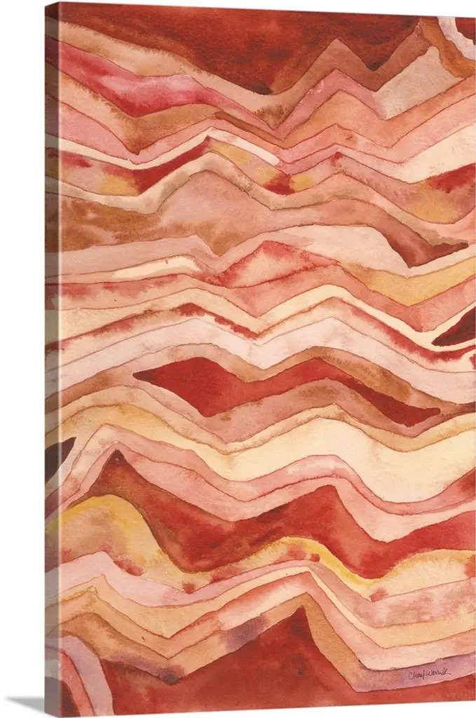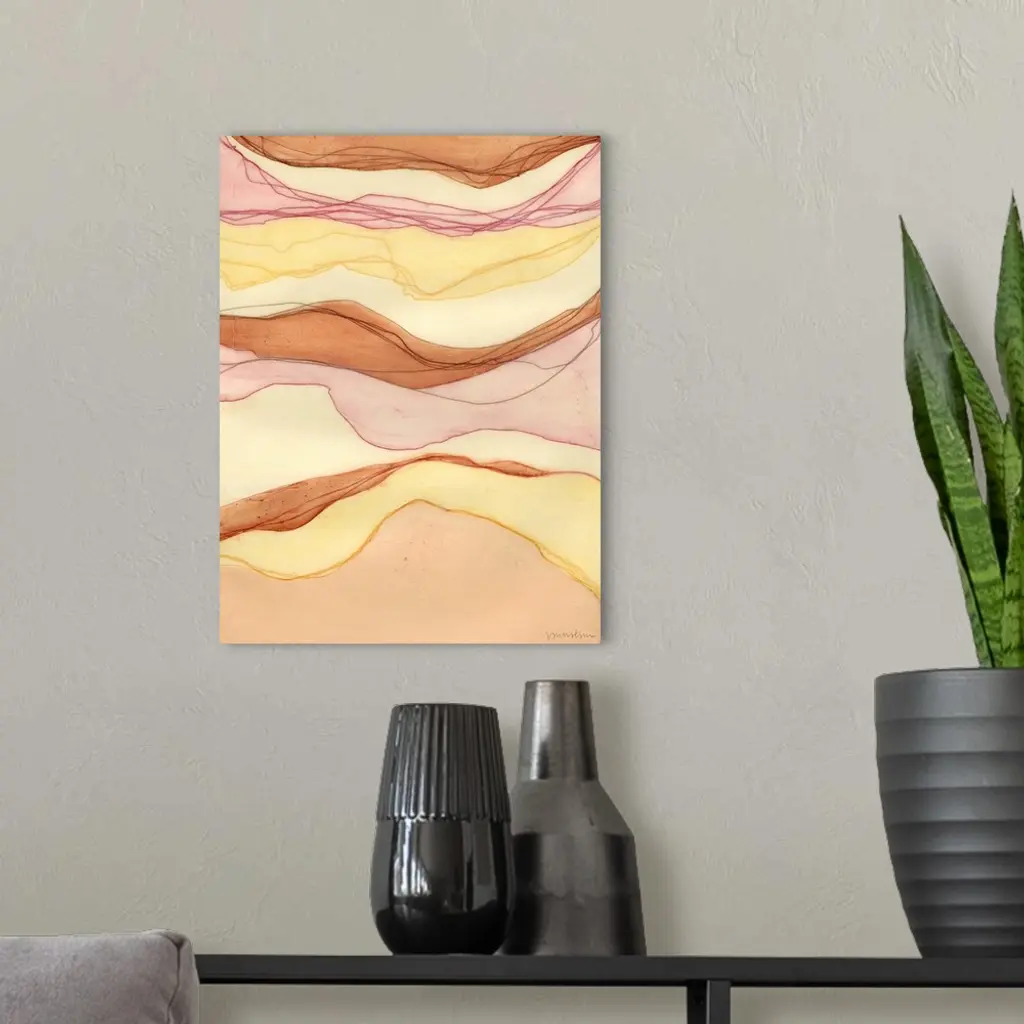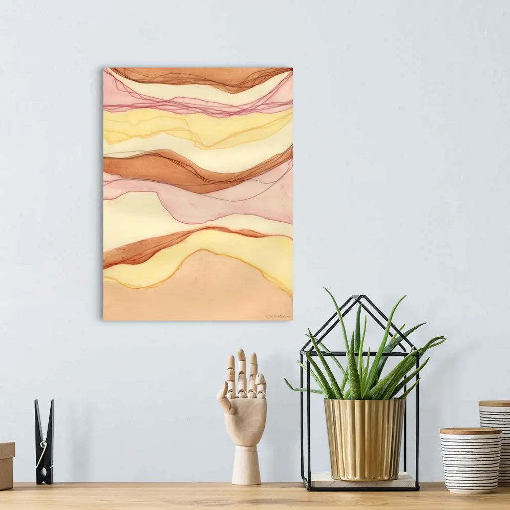 Contemporary abstract painting of what resembles a cross section of stone showing layers of in different muted tones.