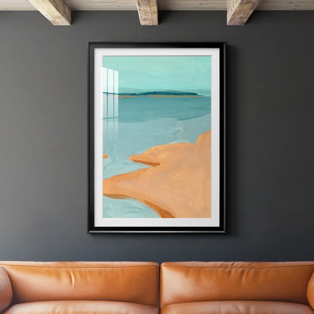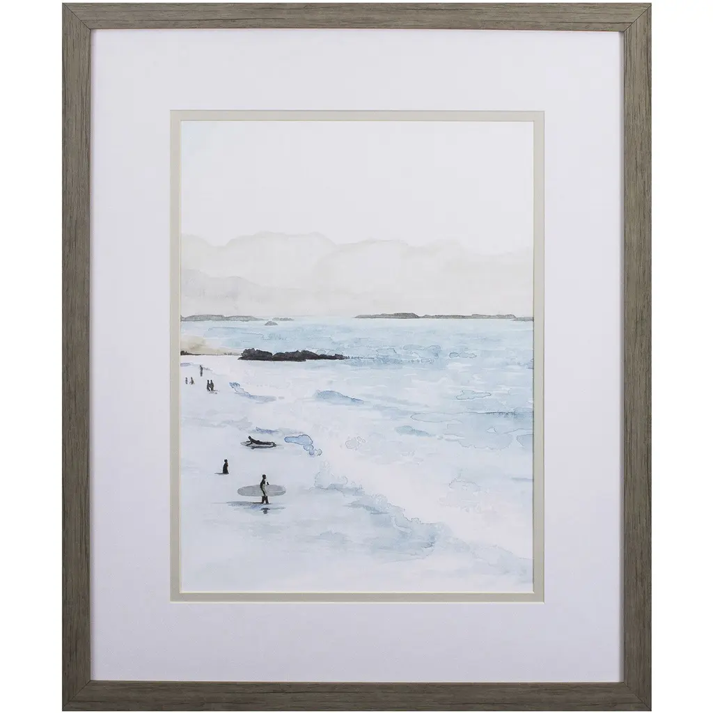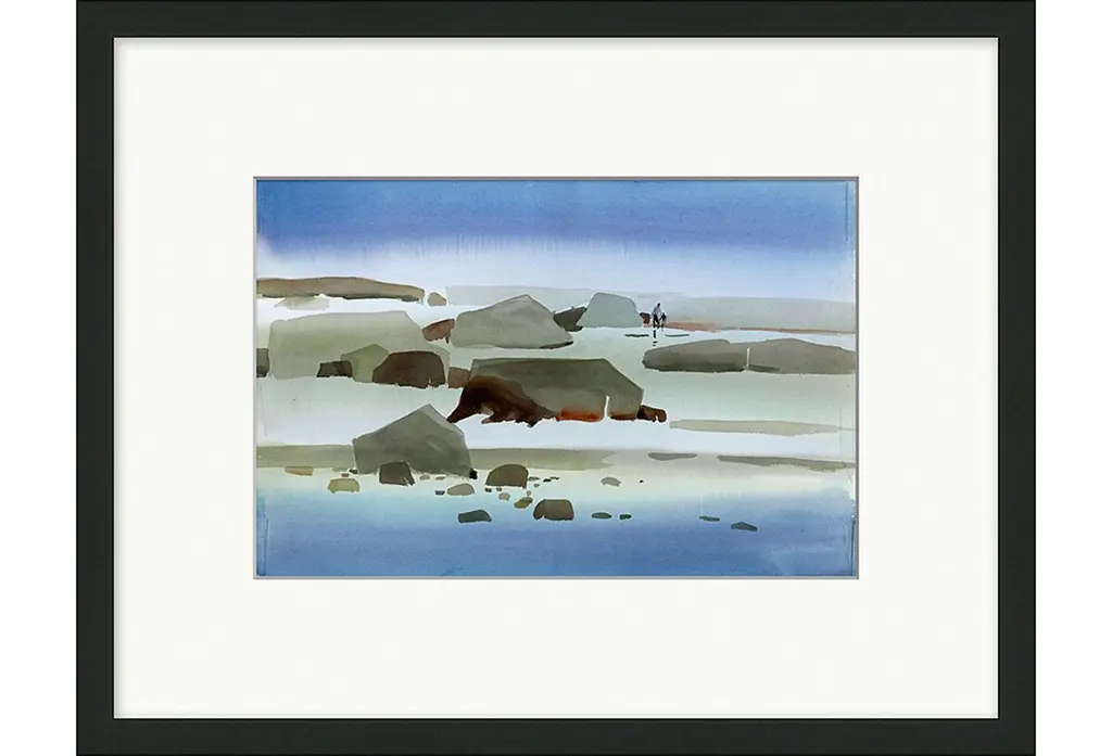 Designed by us and available only at One Kings Lane: A reproduction of an original painting, this contemporary watercolor depicts the rocky shores of Cape Cod between the sea and sky. Printed on matte paper with an off-white mat and beautifully framed, this piece arrives ready to hang.
