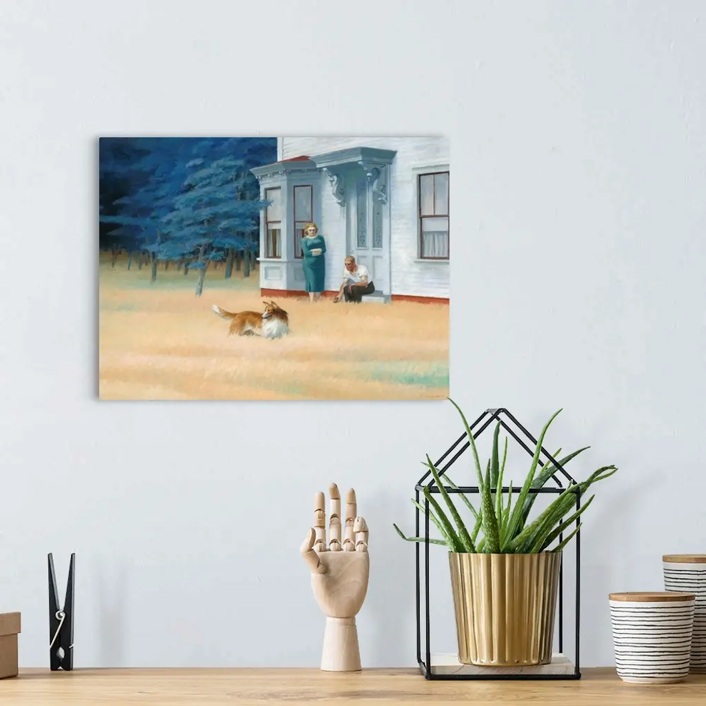 Cape Cod Evening, by Edward Hopper, 1939, American painting, oil on canvas. Hopper described this painting as: 'In the woman I attempted to get the broad, strong-jawed face and blond hair of a Finnish type of which there are many on the Cape. The man is a
