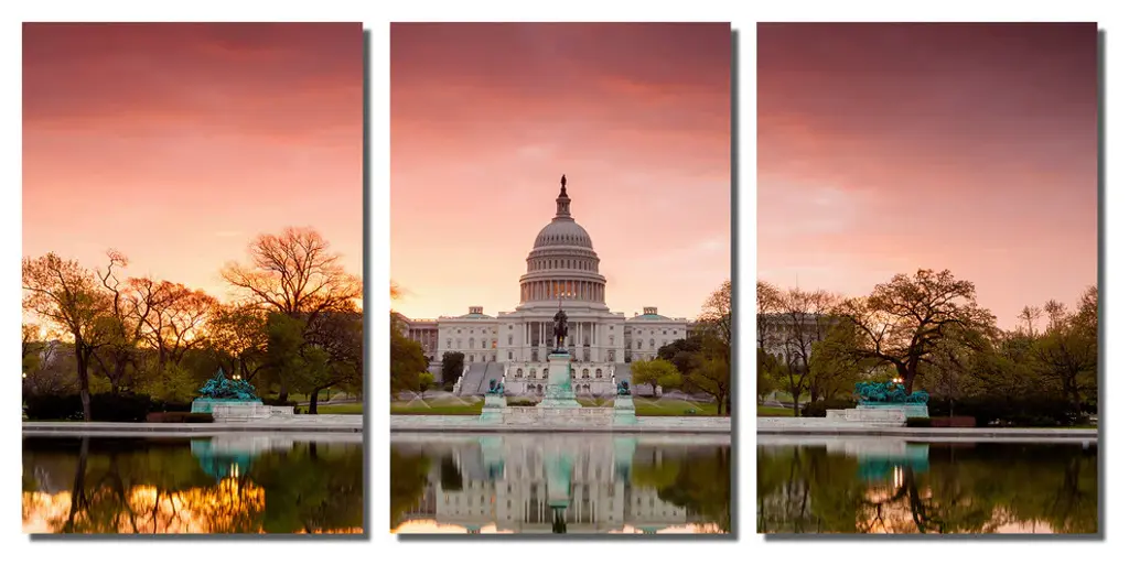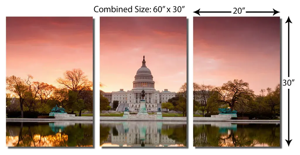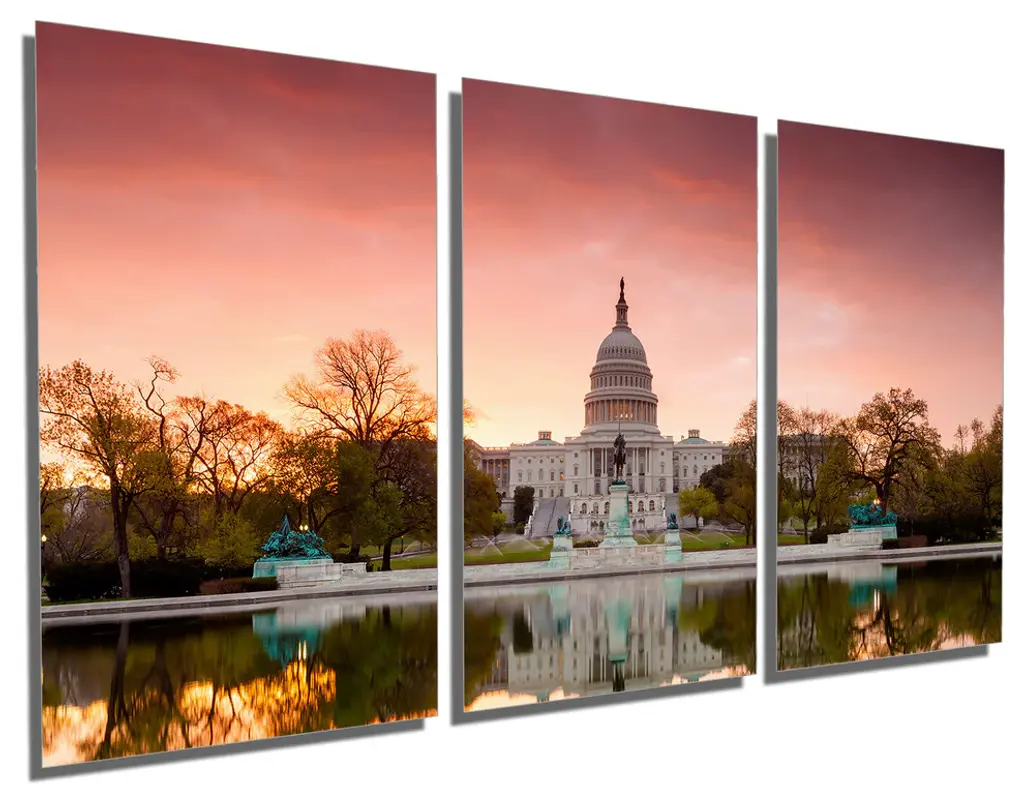 60"œ x 30"œ total size. Ready To Hang! (3 pieces - 20"œ x 30"œ each). 3 Panel Split (Triptych) Metal Print featuring the United States Capitol building in Washington DC. Modern metal wall art for home or office wall decor & interior design. Printed on Luxurious, HD aluminum glossy metal panels. Multi panel art.. HD aluminum panels. Metal print wall art. Includes Shadow Wall Mount on the back.• Aluminum Metal Wall Art• Made in USA• Ready to hang - No assembly required• Shadow mount hardware on the back• 0.045"œ thick HD Aluminum Panels• Scratch resistant, glossy finish• Superb color clarity, luxurious prints• Epson printing process• For indoor or moisture rich environment use• Easy to clean. Gently wipe with microfiber cloth.