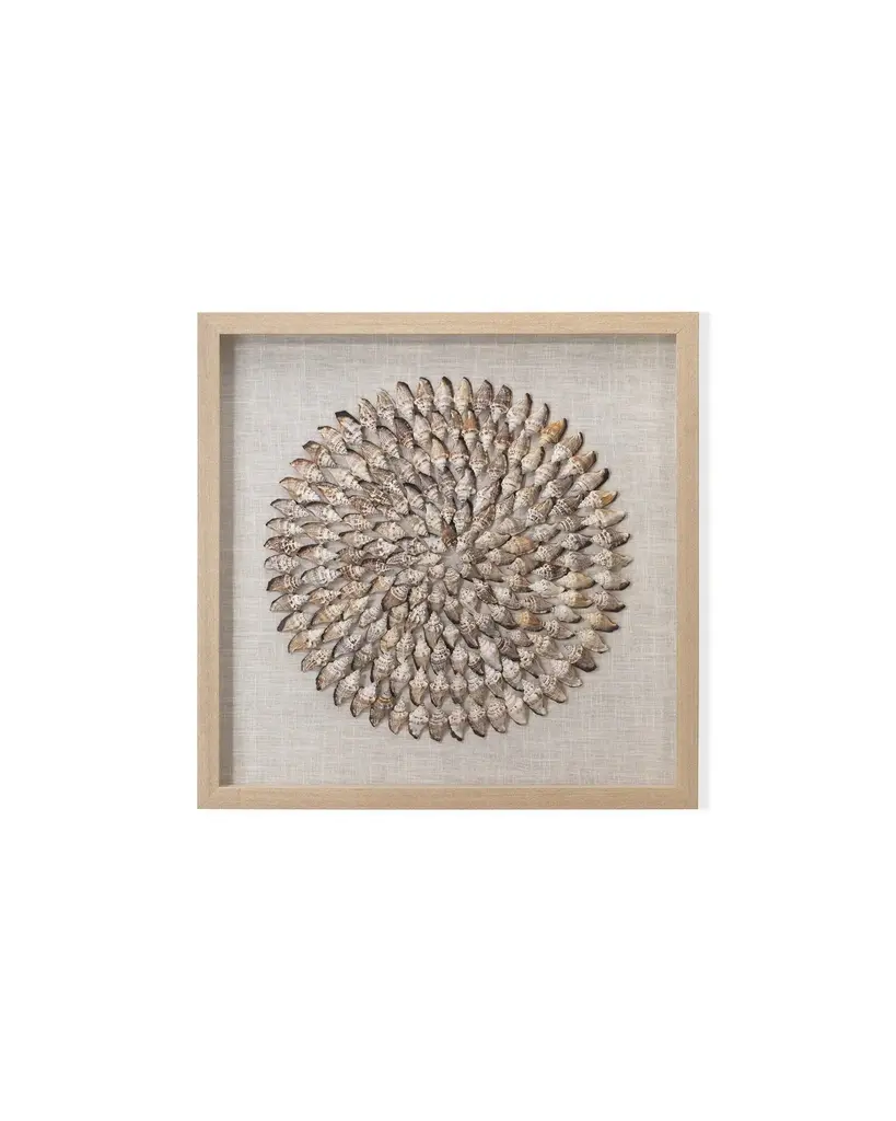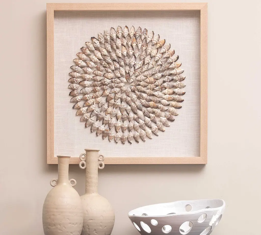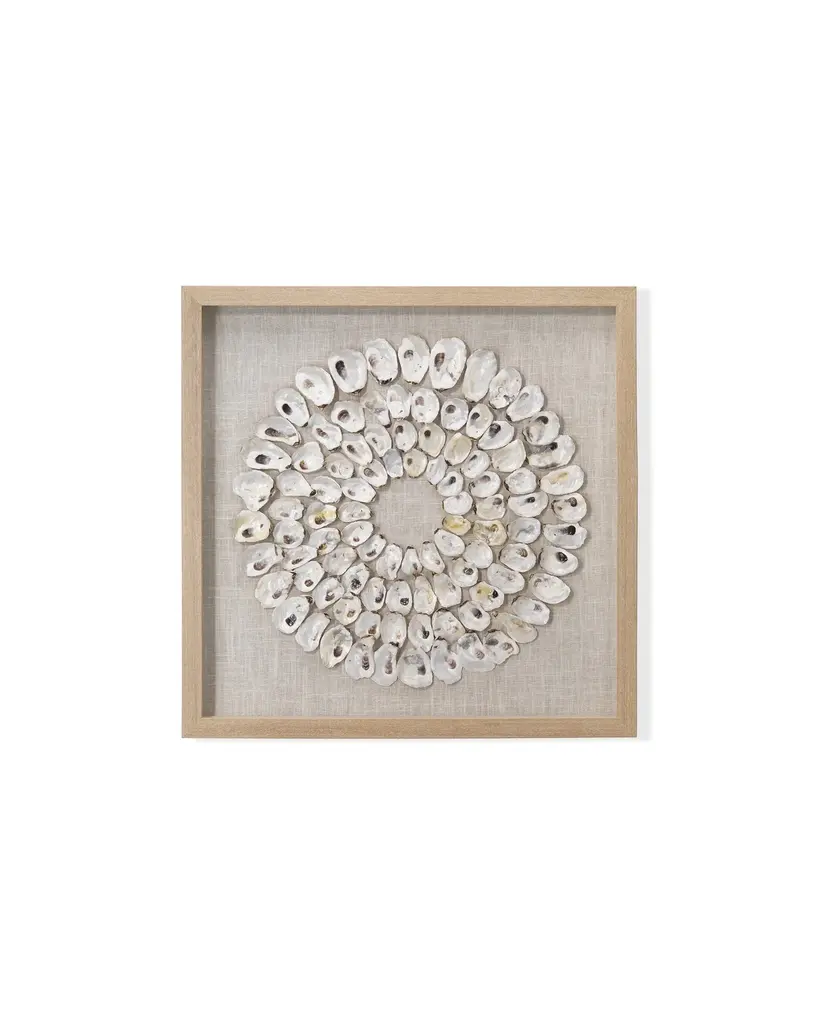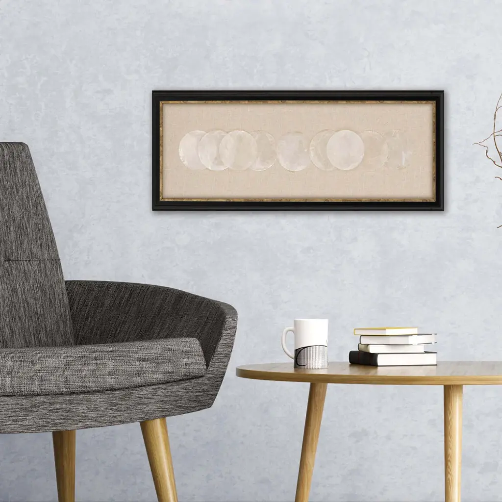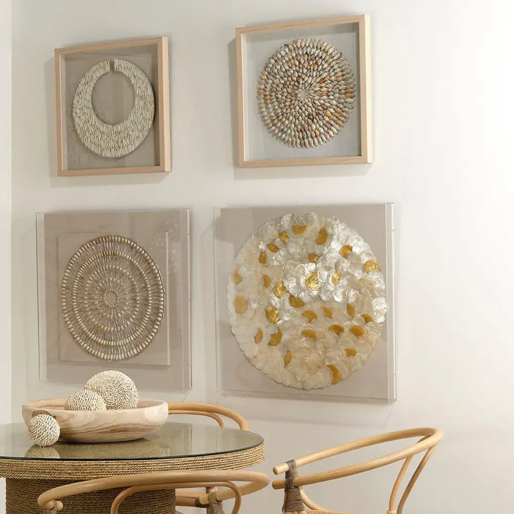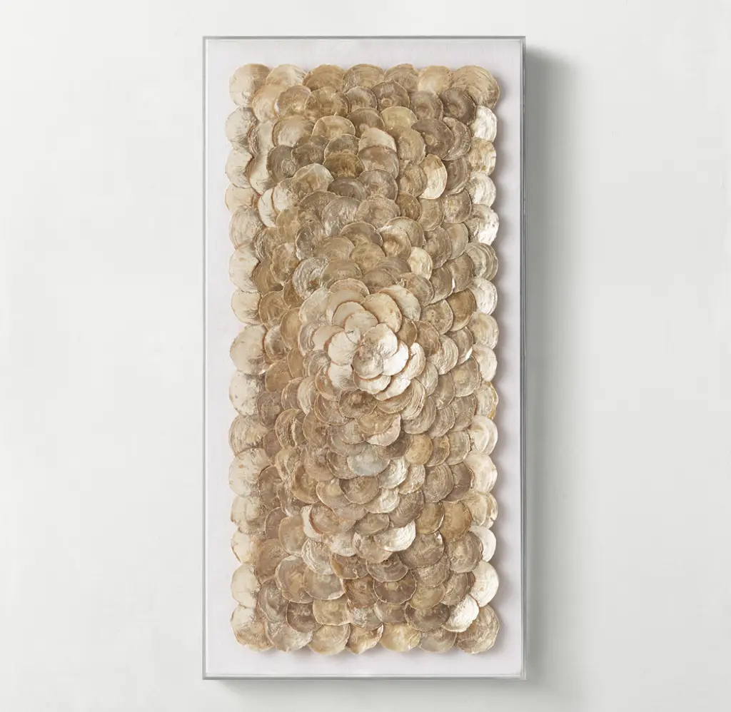 Our artwork celebrates the iridescent shimmer and pleasing round shape of the capiz shell. Artfully layered on a linen backing, they catch the light to beautiful effect, casting a beachy glow.