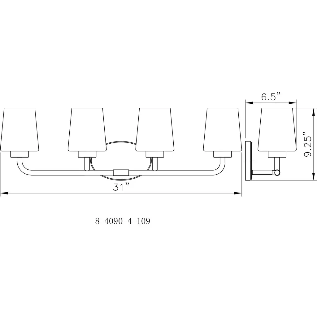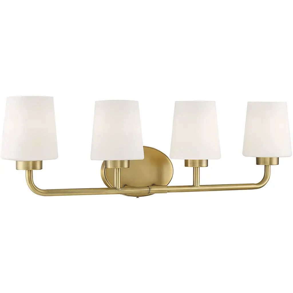 Add chic style to any bathroom with the Savoy House Capra 4-light bath bar. Its substantial structure features classic details along with white opal glass shades that are tapered like lamp shades and open at the top to give off a flattering glow. The large oval-shaped backplate helps to cover up any holes left behind from replacing old bath bars, too. Plus, the hardware for this fixture has been thoughtfully moved to the side of the backplate, allowing for a crisp and clean look. Finished in warm brass. This fixture is 31" wide and 9" tall. It extends 6.5" from the wall. Uses 4 standard size bulbs of up to 60 watts each (not included).
