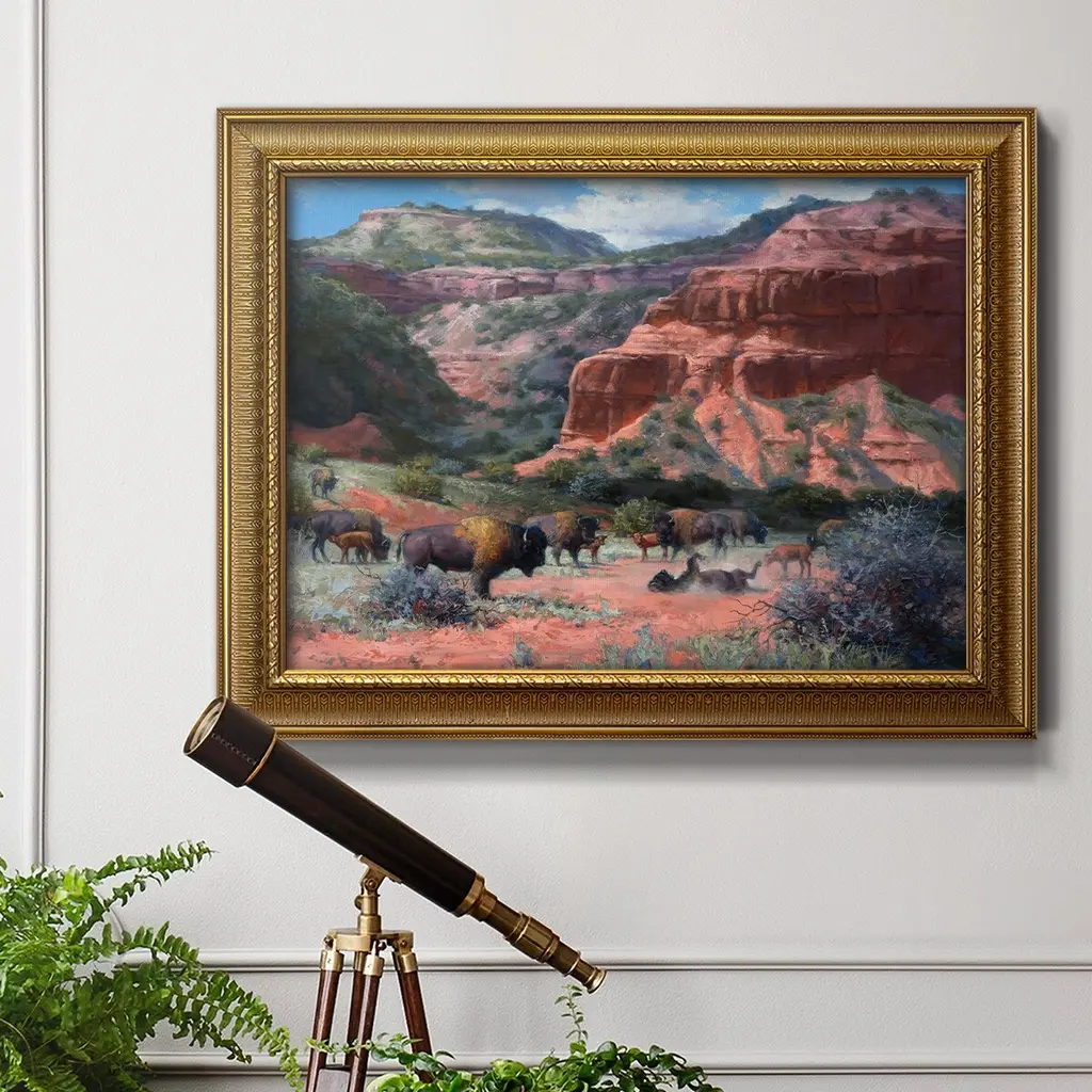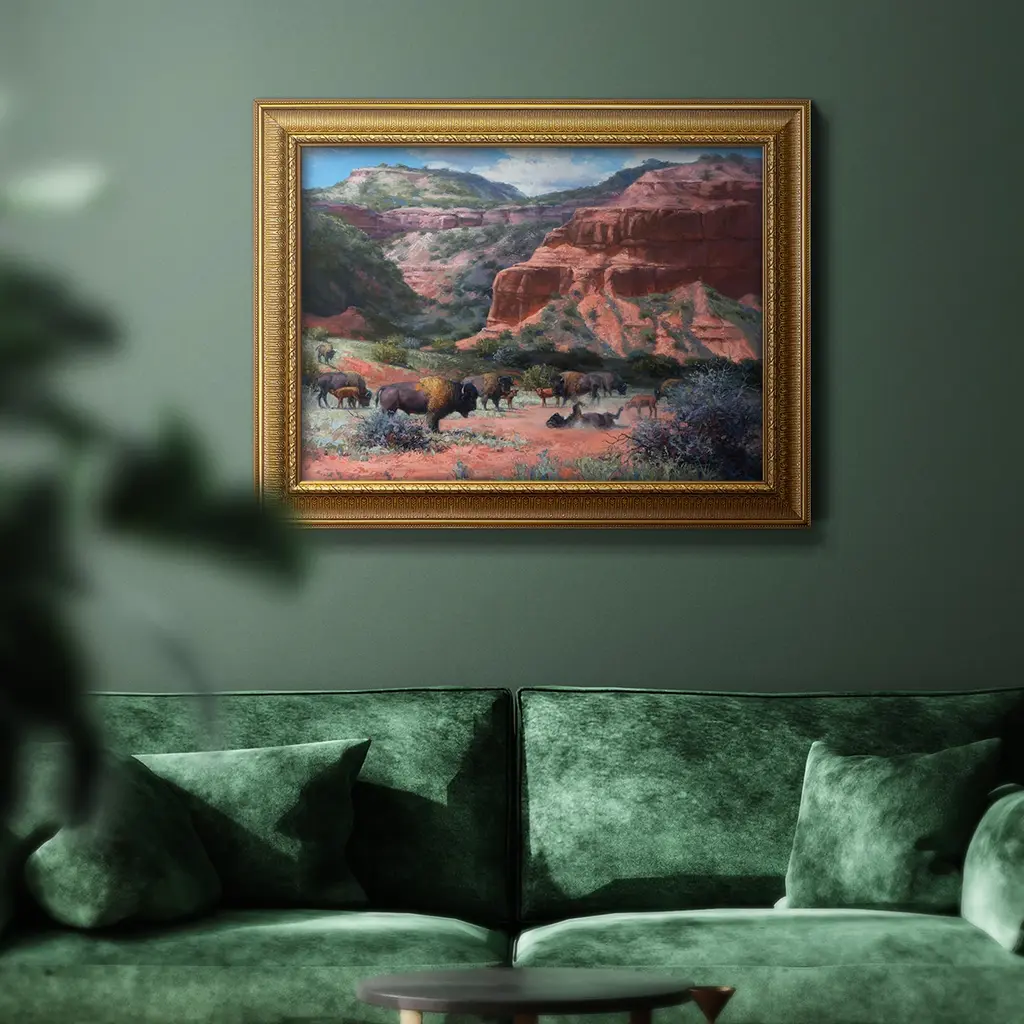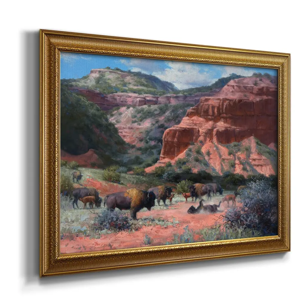 Caprock Canyon Premium Framed Canvas- Ready to Hang A Premium Framed Canvas created to last. Framed in distressed wood and available in an array of sizes and colors Featuring a beveled a solid wood stretcher bar, each piece comes ready to hand 3 SIZES AVAILABLE 16''X20'' - Overall Size 18'X27'' - Overall Size 24''x36'' - Overall Size Each piece is made to order. Each piece comes with hanging hardware. Made in the USA Ready to Hang Giclee Paper Print Acrylic Glass Beveled Matt Board