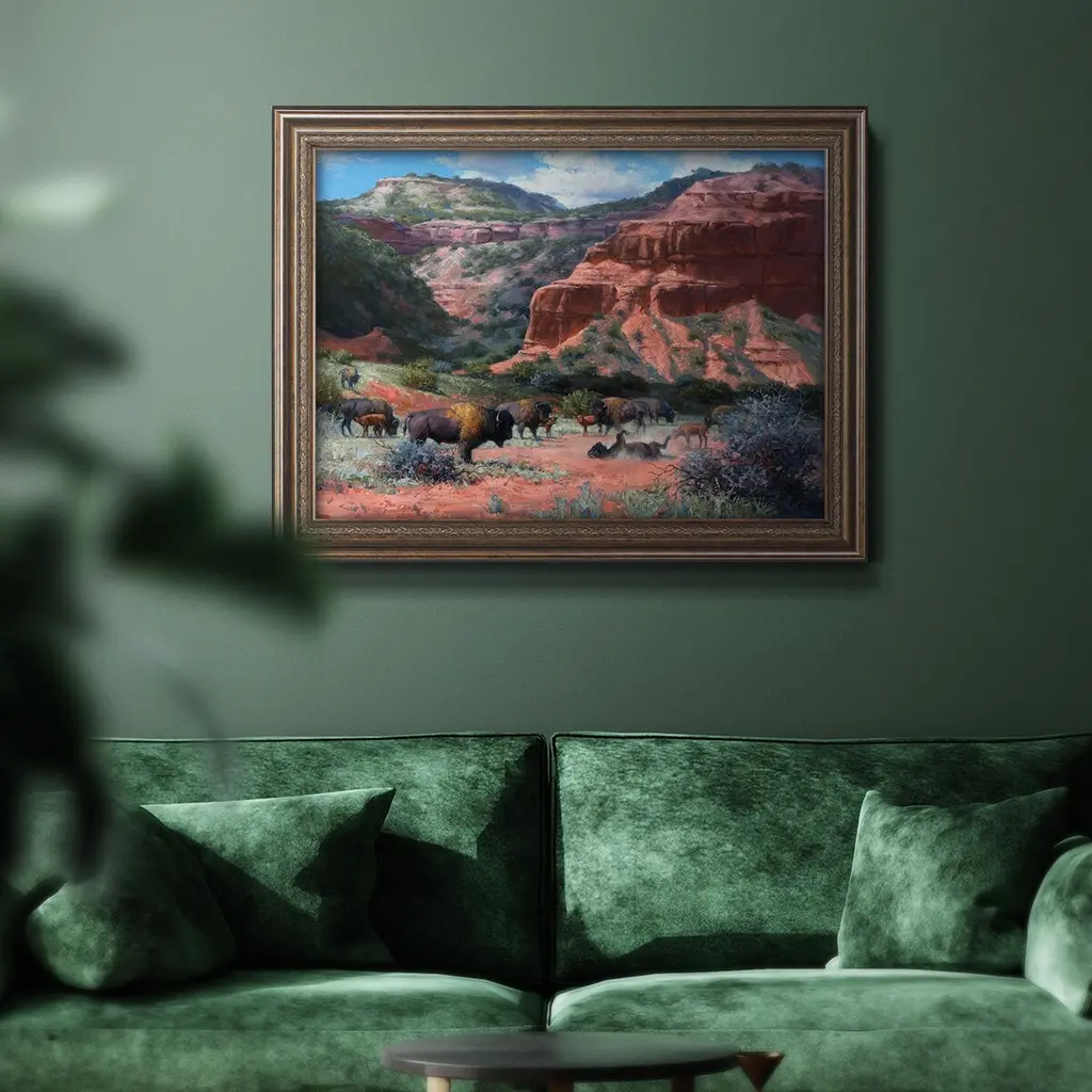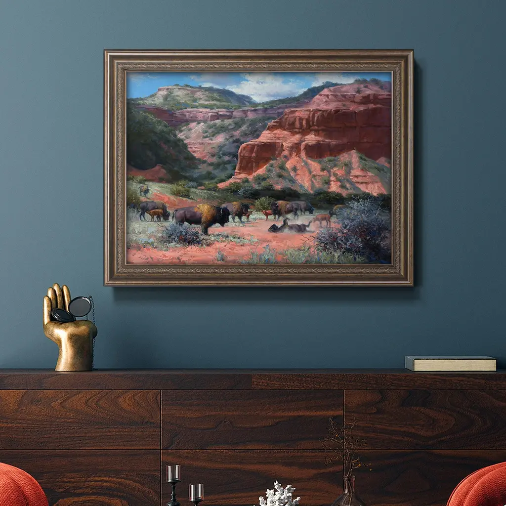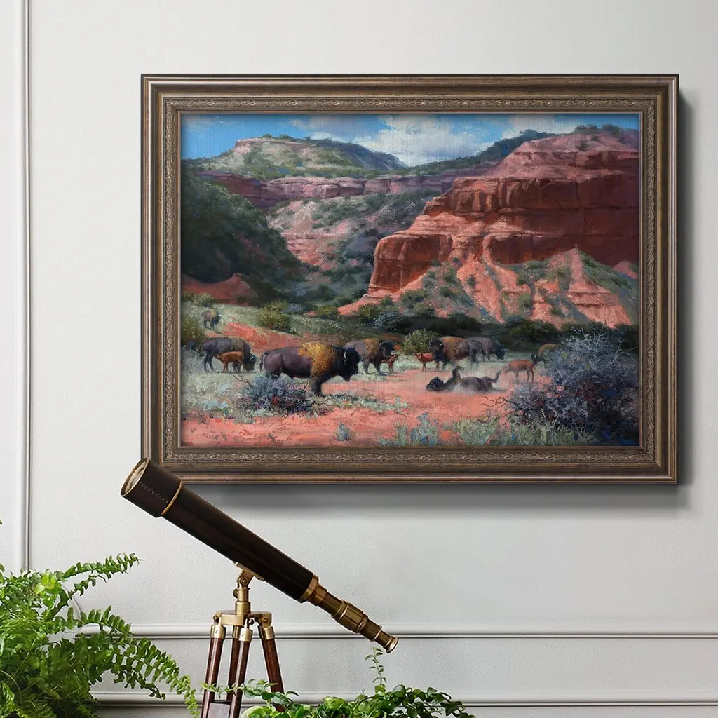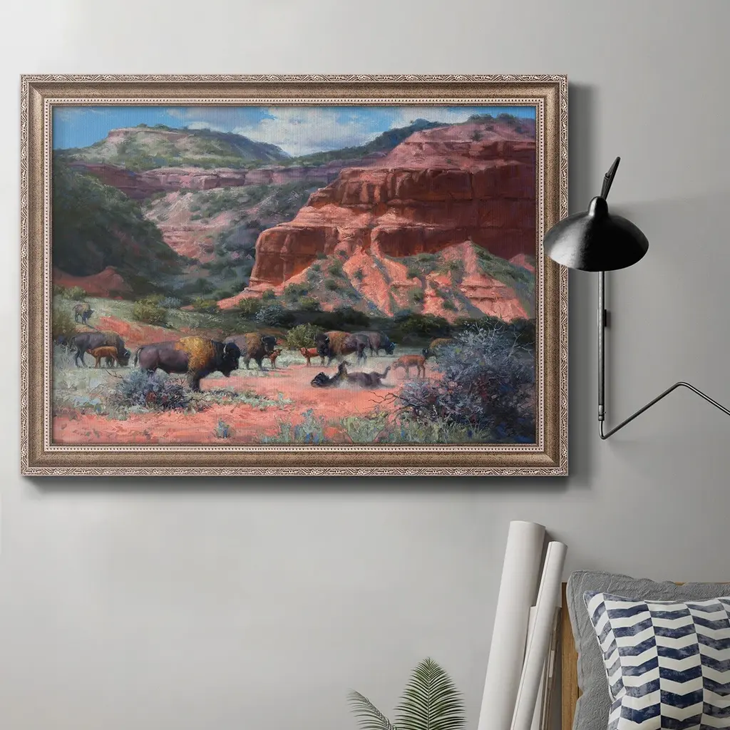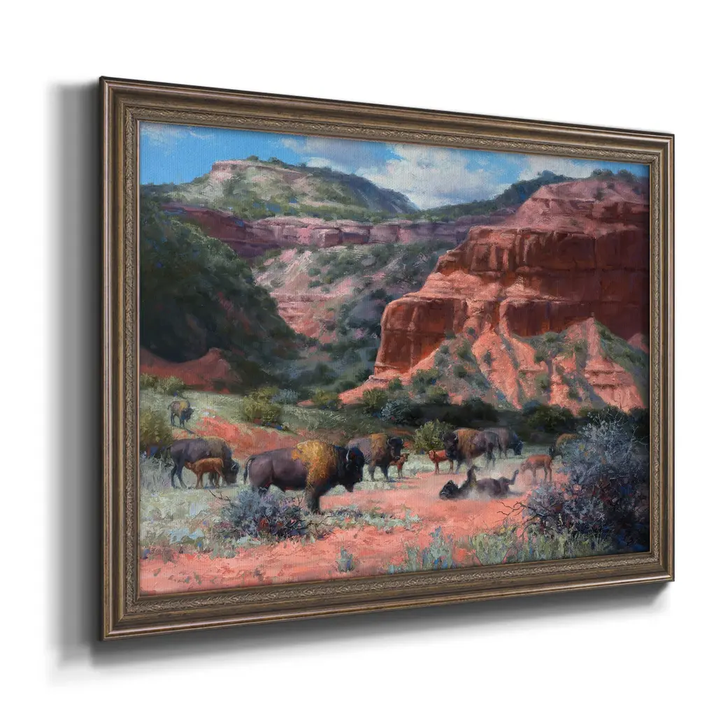 Caprock Canyon Premium Framed Canvas- Ready to Hang A Premium Framed Canvas created to last. Framed in distressed wood and available in an array of sizes and colors Featuring a beveled a solid wood stretcher bar, each piece comes ready to hand 3 SIZES AVAILABLE 16''X20'' - Overall Size 18'X27'' - Overall Size 24''x36'' - Overall Size Each piece is made to order. Each piece comes with hanging hardware. Made in the USA Ready to Hang Giclee Paper Print Acrylic Glass Beveled Matt Board