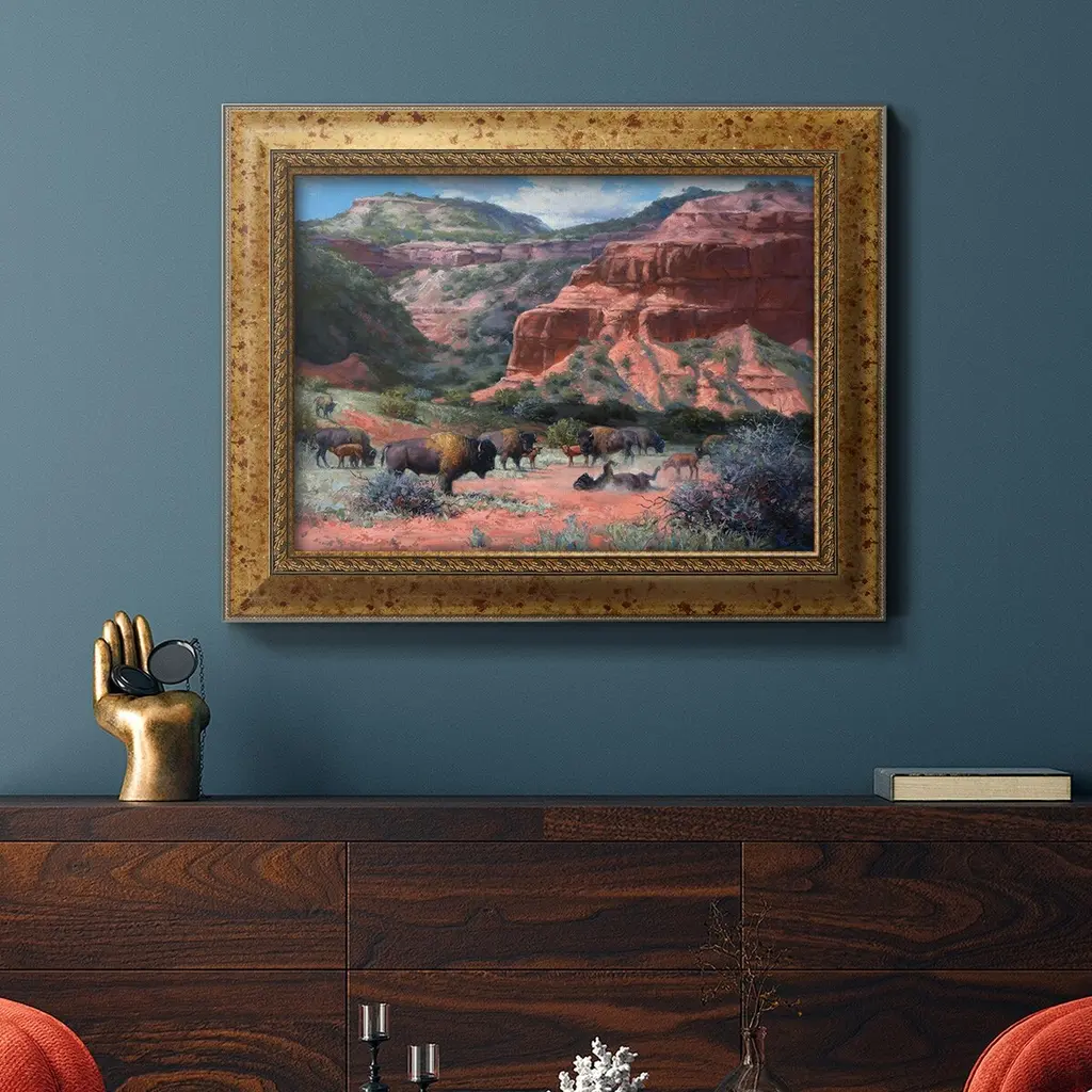 Caprock Canyon Premium Framed Canvas- Ready to Hang A Premium Framed Canvas created to last. Framed in distressed wood and available in an array of sizes and colors Featuring a beveled a solid wood stretcher bar, each piece comes ready to hand 3 SIZES AVAILABLE 16''X20'' - Overall Size 18'X27'' - Overall Size 24''x36'' - Overall Size Each piece is made to order. Each piece comes with hanging hardware. Made in the USA Ready to Hang Giclee Paper Print Acrylic Glass Beveled Matt Board