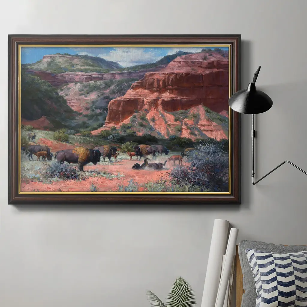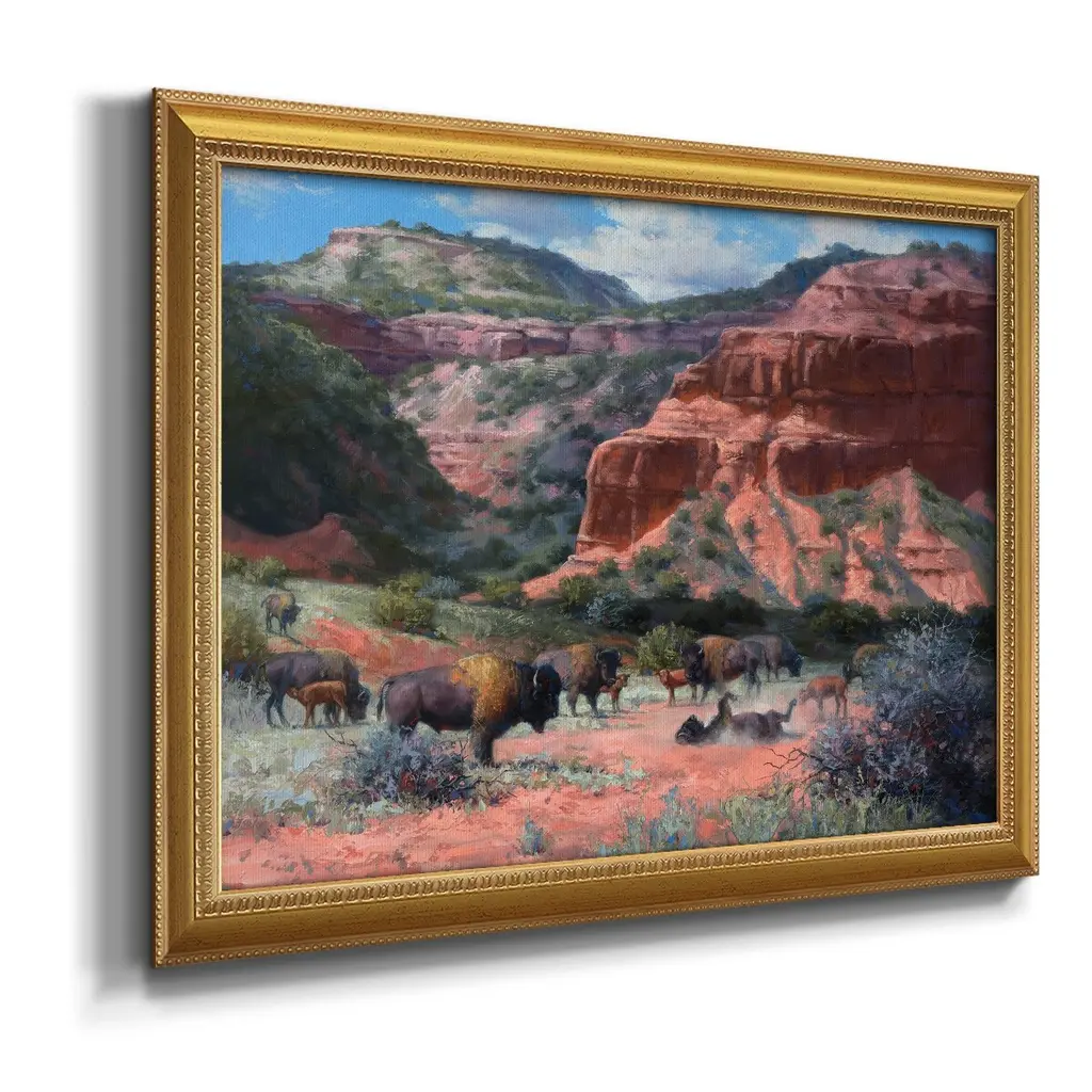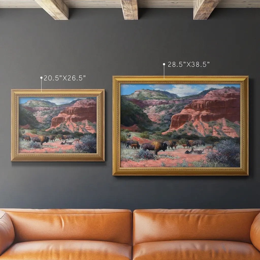Caprock Canyon Premium Framed Canvas- Ready to Hang A Premium Framed Canvas created to last. Framed in distressed wood and available in an array of sizes and colors Featuring a beveled a solid wood stretcher bar, each piece comes ready to hand 3 SIZES AVAILABLE 16''X20'' - Overall Size 18'X27'' - Overall Size 24''x36'' - Overall Size Each piece is made to order. Each piece comes with hanging hardware. Made in the USA Ready to Hang Giclee Paper Print Acrylic Glass Beveled Matt Board