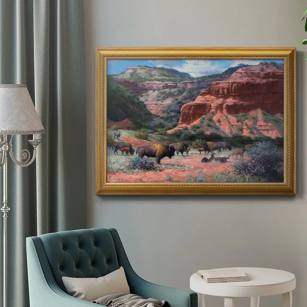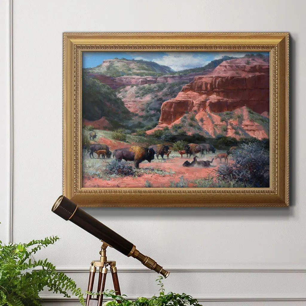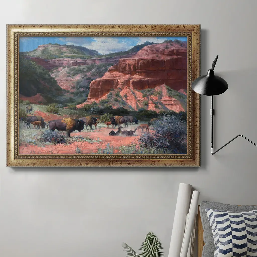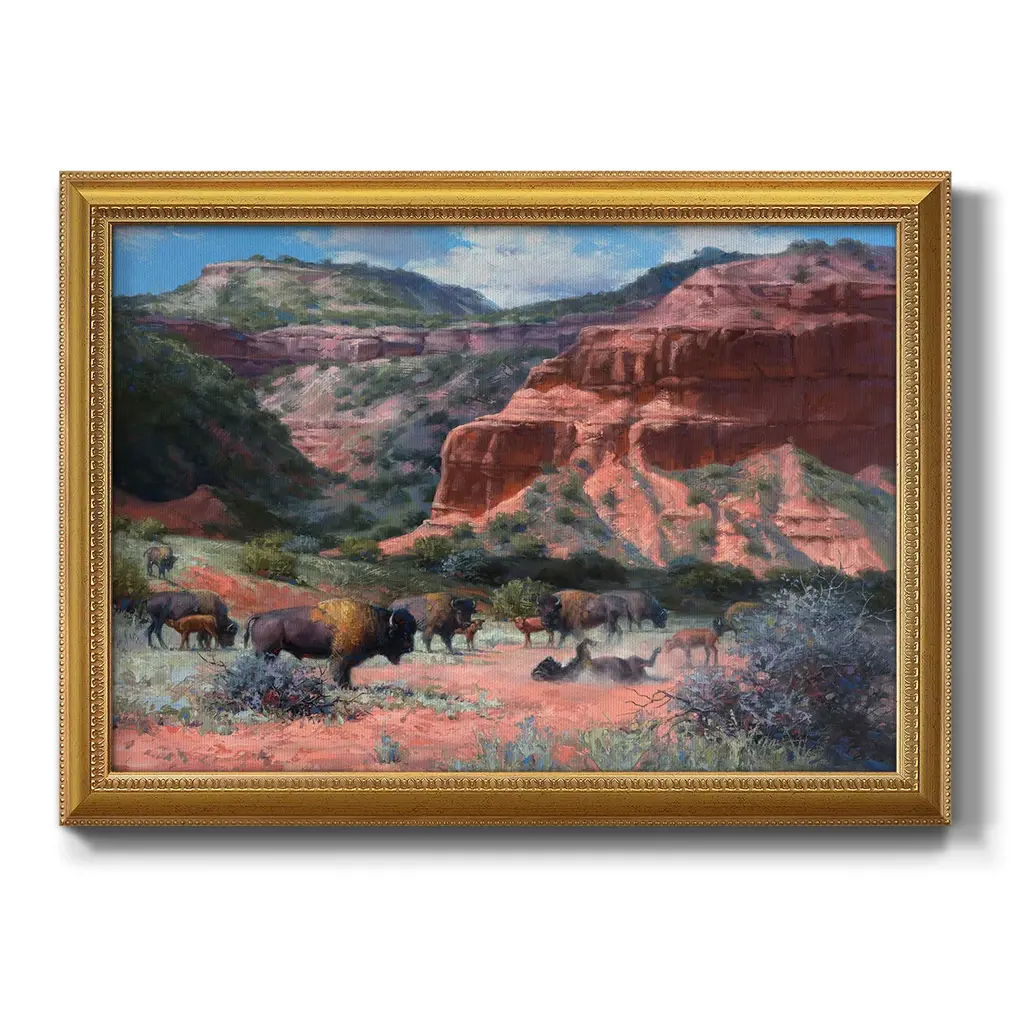 Caprock Canyon Premium Framed Canvas- Ready to Hang A Premium Framed Canvas created to last. Framed in distressed wood and available in an array of sizes and colors Featuring a beveled a solid wood stretcher bar, each piece comes ready to hand 3 SIZES AVAILABLE 16''X20'' - Overall Size 18'X27'' - Overall Size 24''x36'' - Overall Size Each piece is made to order. Each piece comes with hanging hardware. Made in the USA Ready to Hang Giclee Paper Print Acrylic Glass Beveled Matt Board