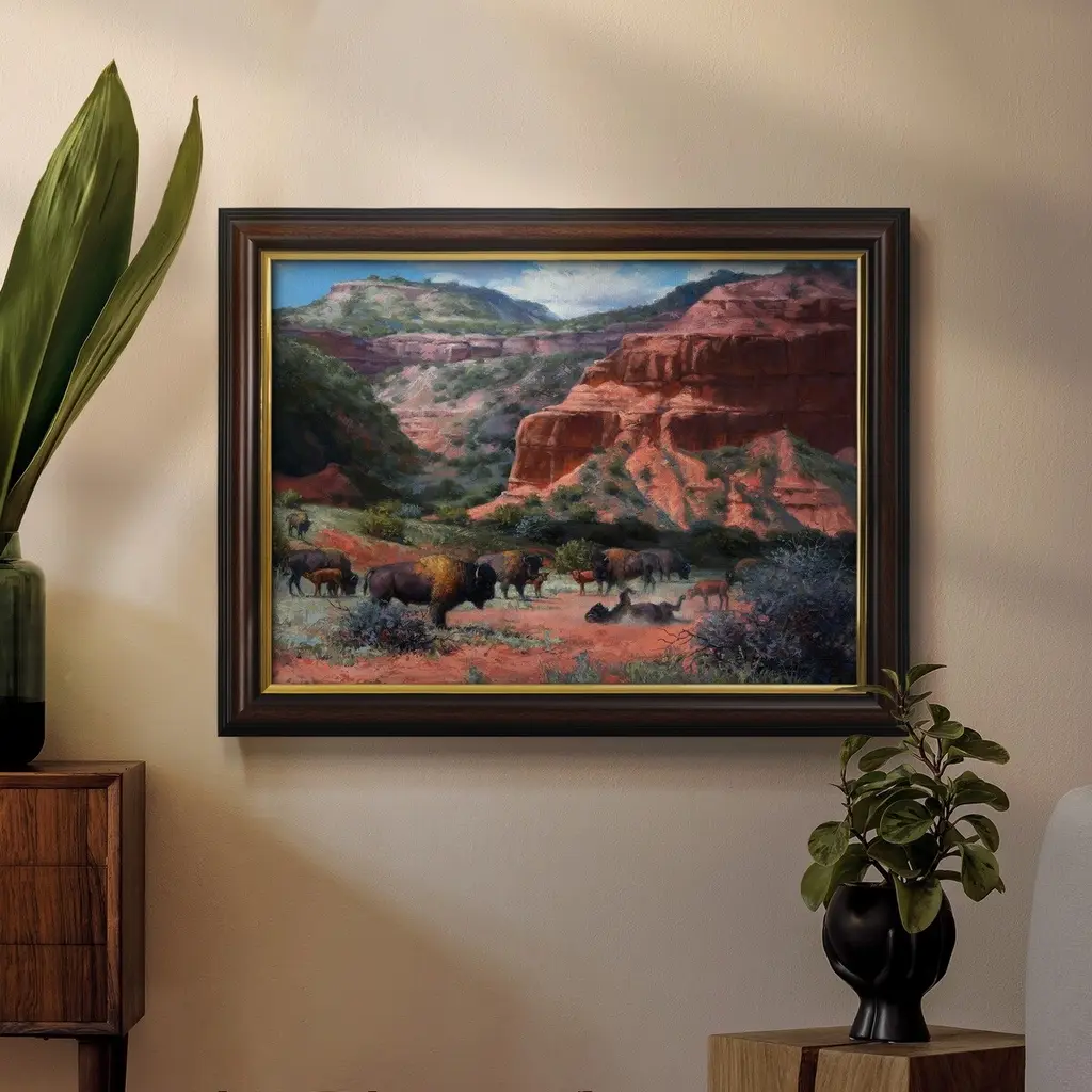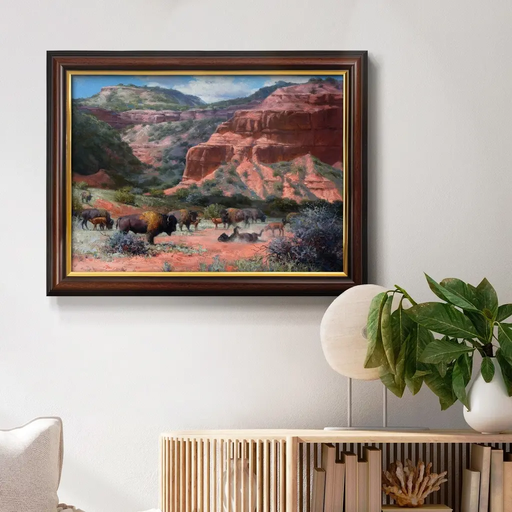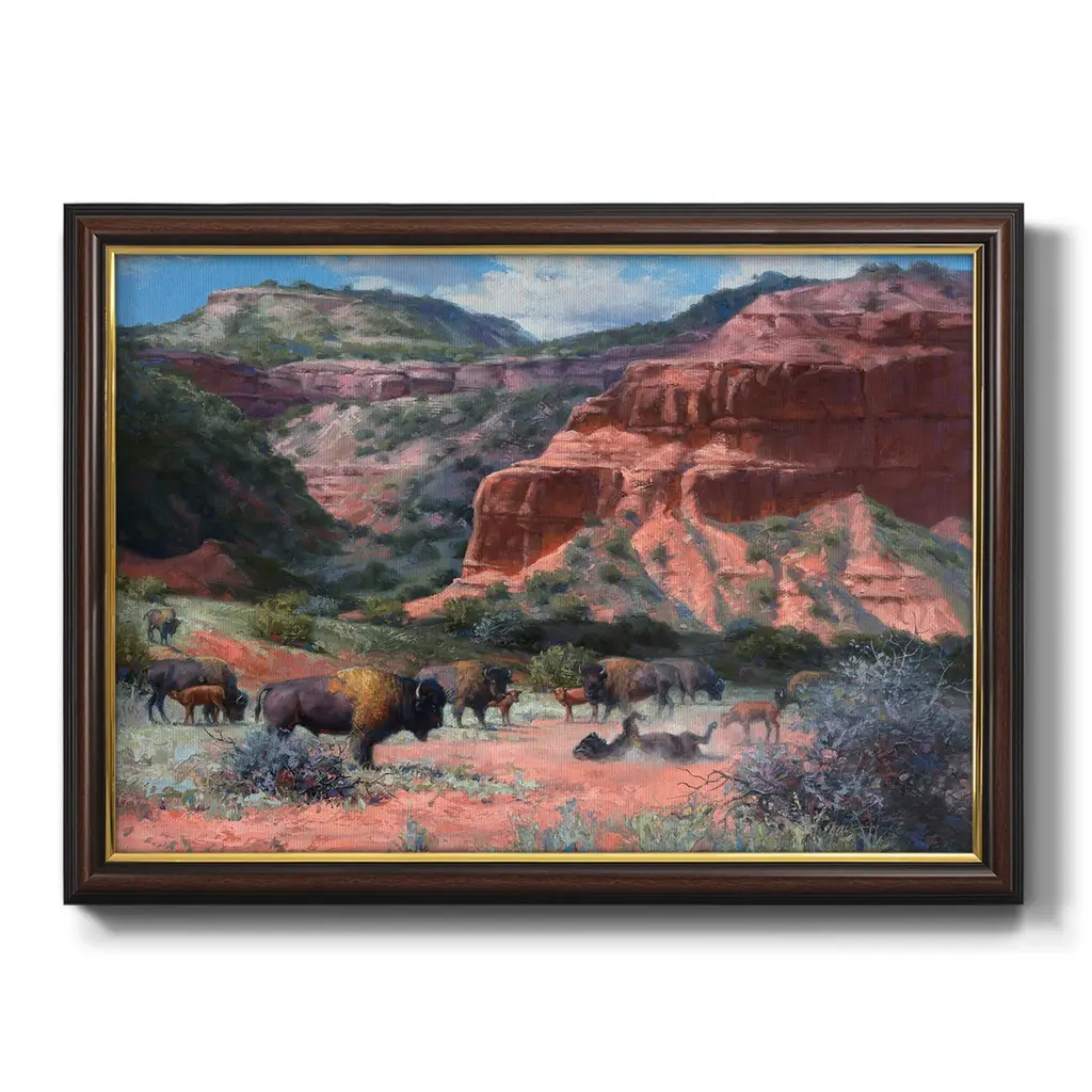 Caprock Canyon Premium Framed Canvas- Ready to Hang A Premium Framed Canvas created to last. Framed in distressed wood and available in an array of sizes and colors Featuring a beveled a solid wood stretcher bar, each piece comes ready to hand 3 SIZES AVAILABLE 16''X20'' - Overall Size 18'X27'' - Overall Size 24''x36'' - Overall Size Each piece is made to order. Each piece comes with hanging hardware. Made in the USA Ready to Hang Giclee Paper Print Acrylic Glass Beveled Matt Board