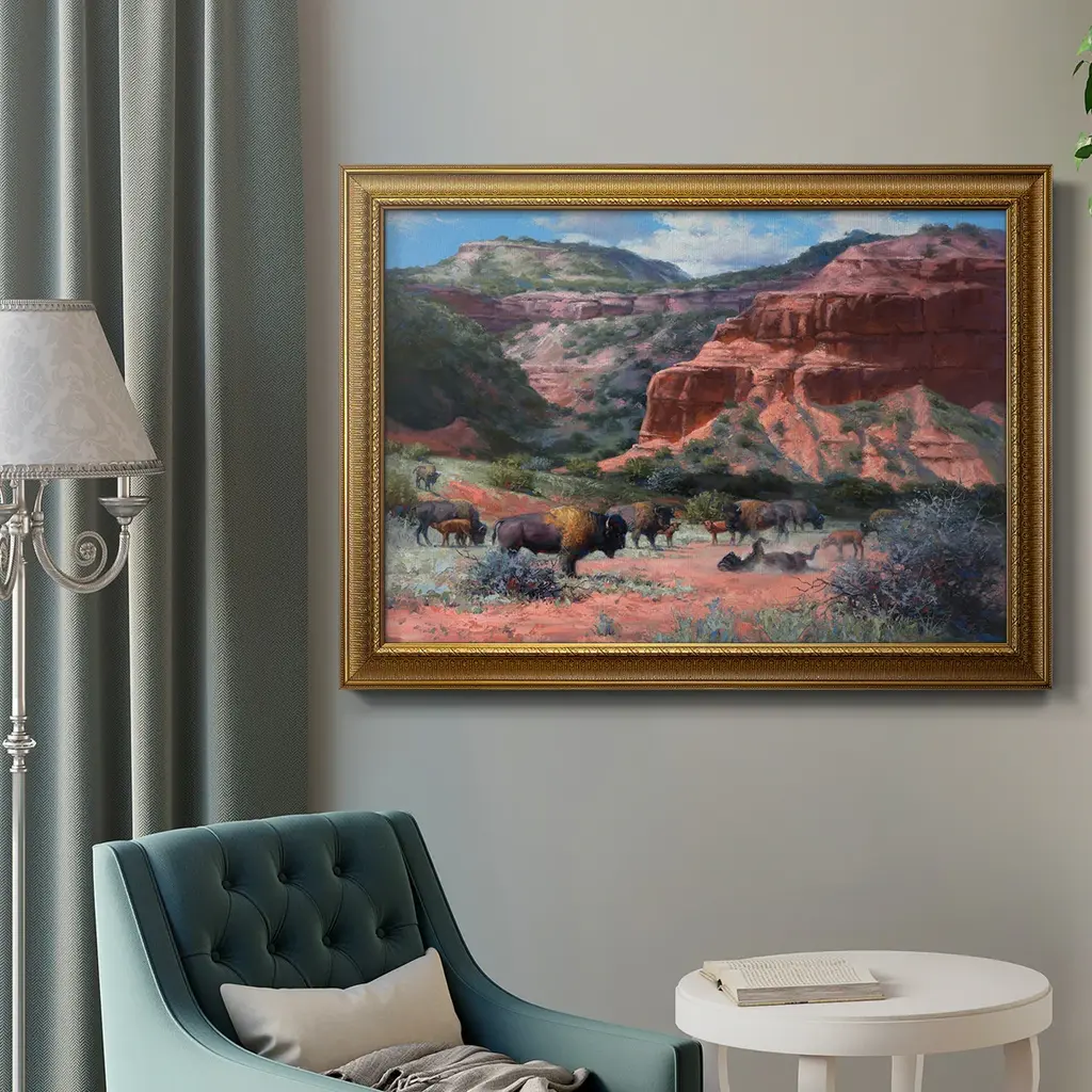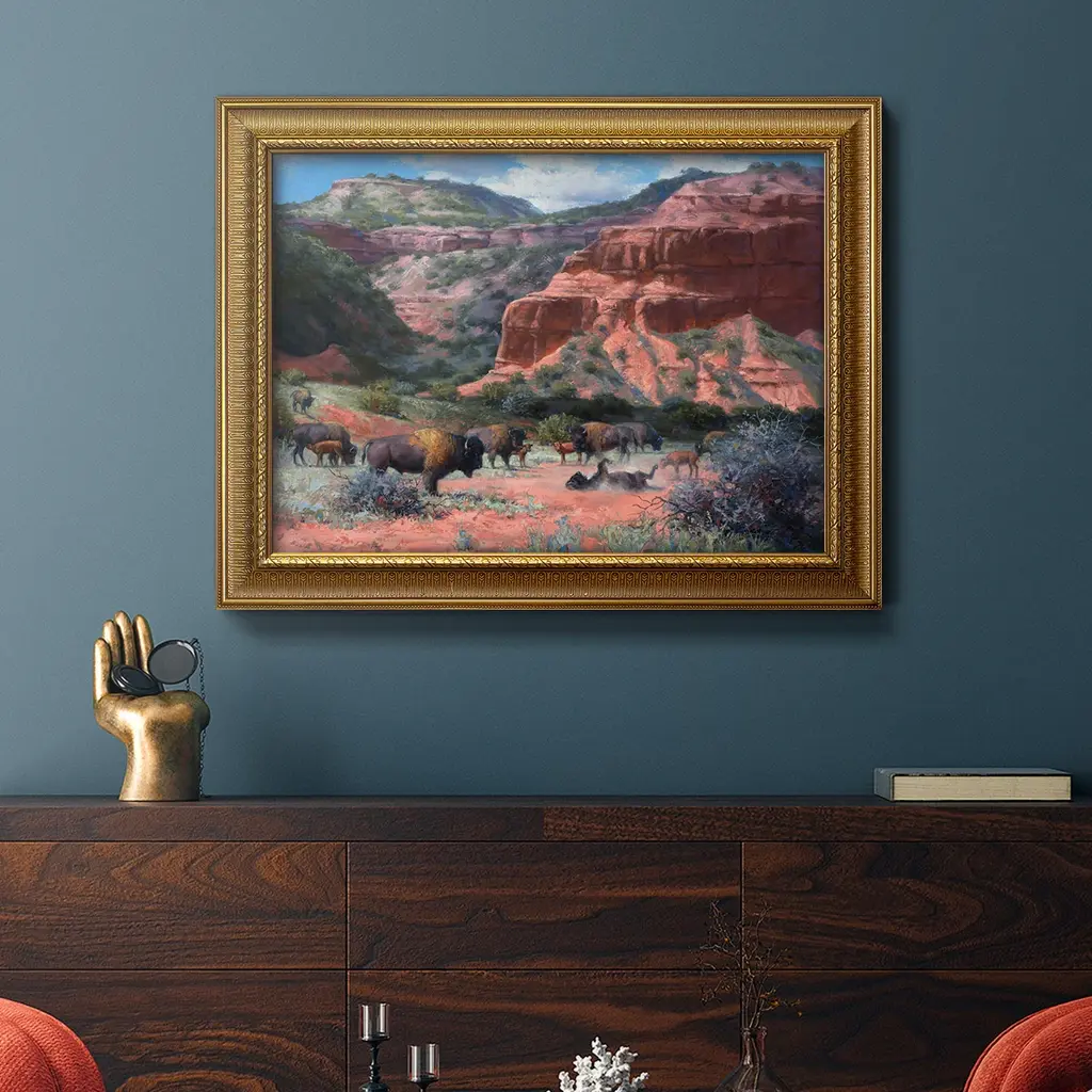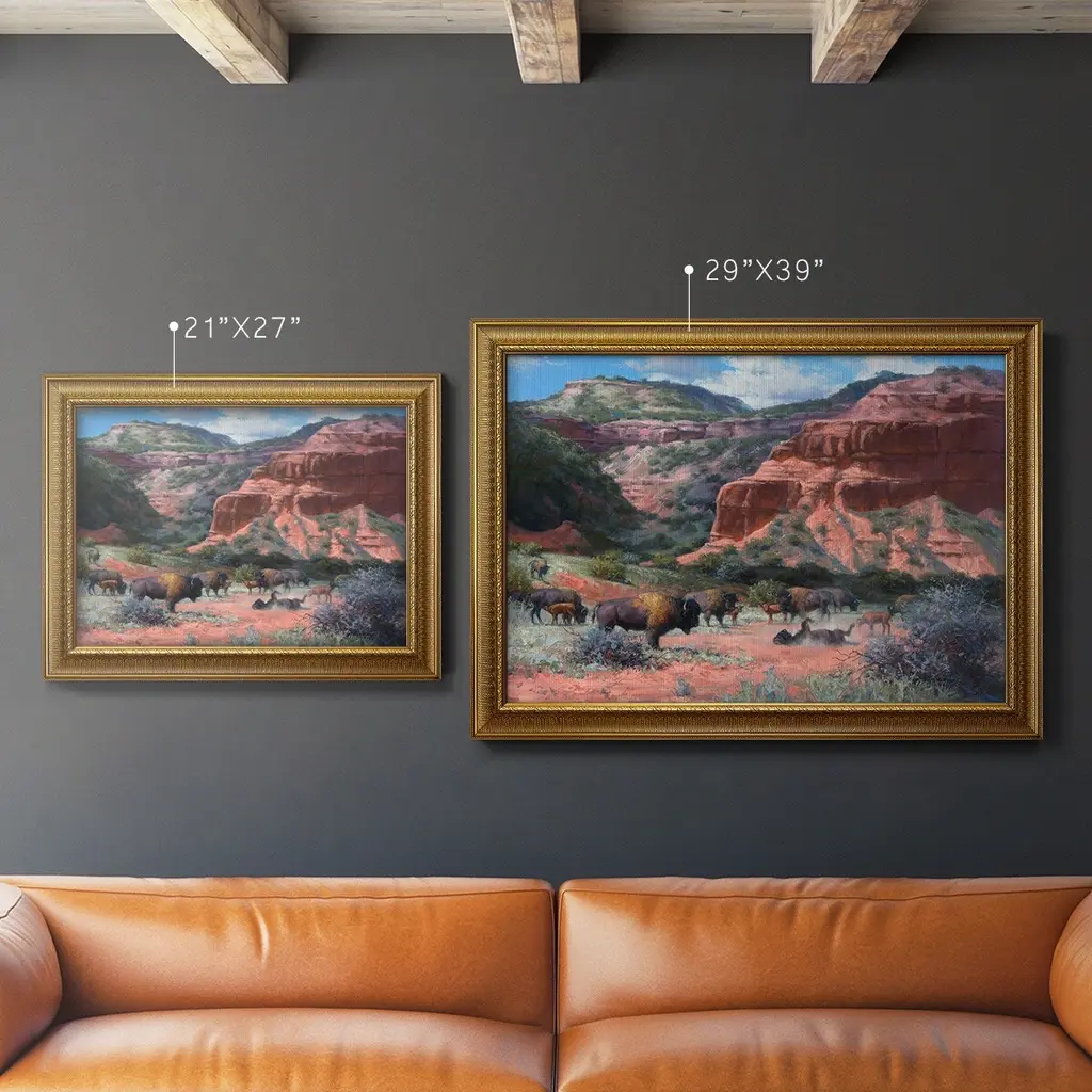 Caprock Canyon Premium Framed Canvas- Ready to Hang A Premium Framed Canvas created to last. Framed in distressed wood and available in an array of sizes and colors Featuring a beveled a solid wood stretcher bar, each piece comes ready to hand 3 SIZES AVAILABLE 16''X20'' - Overall Size 18'X27'' - Overall Size 24''x36'' - Overall Size Each piece is made to order. Each piece comes with hanging hardware. Made in the USA Ready to Hang Giclee Paper Print Acrylic Glass Beveled Matt Board