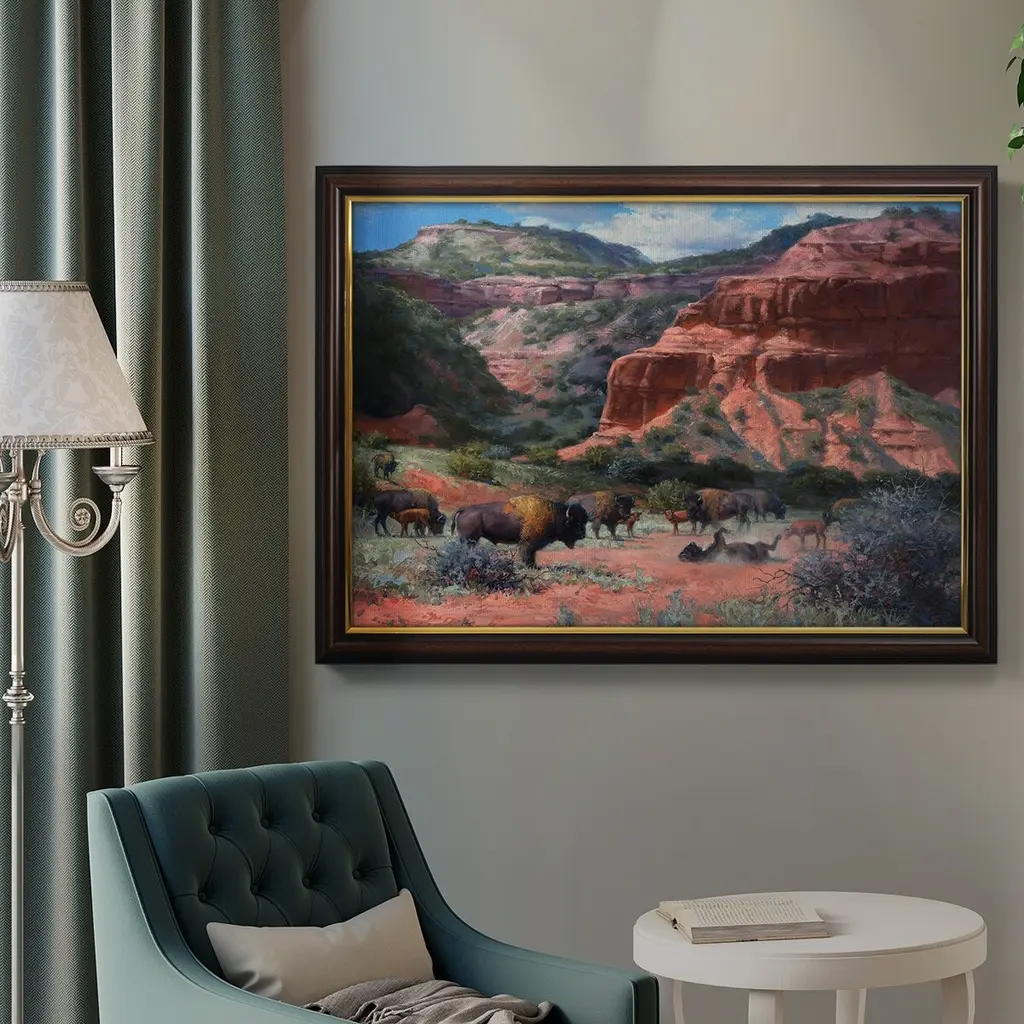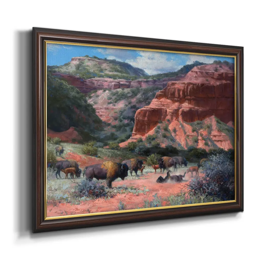 Caprock Canyon Premium Framed Canvas- Ready to Hang A Premium Framed Canvas created to last. Framed in distressed wood and available in an array of sizes and colors Featuring a beveled a solid wood stretcher bar, each piece comes ready to hand 3 SIZES AVAILABLE 16''X20'' - Overall Size 18'X27'' - Overall Size 24''x36'' - Overall Size Each piece is made to order. Each piece comes with hanging hardware. Made in the USA Ready to Hang Giclee Paper Print Acrylic Glass Beveled Matt Board