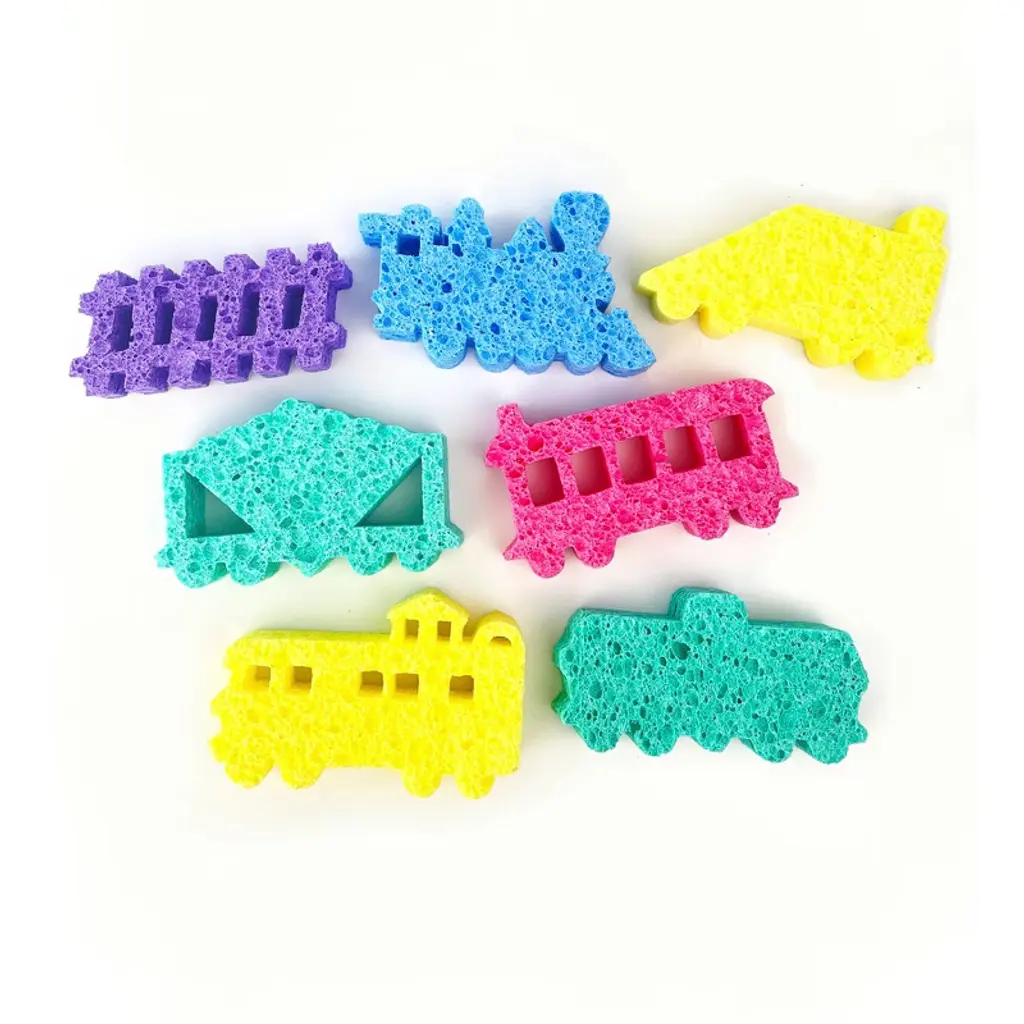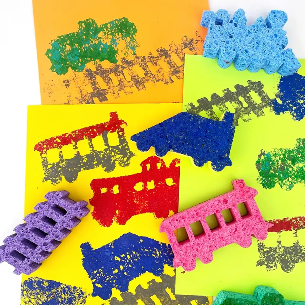 Captain Creative Super Sponges Train Pack | Captain Creative Super Sponges are a fun and functional addition to any classroom, art room, or play space. Made in the USA from high-quality, real cellulose material, these durable sponges are 1" thick and perfect for sponge painting, sand and water tables, and water play. The Train Pack includes a variety of die-cut shapes, with variations in color and quantity that make each set unique—while still delivering consistent quality and value. Designed for creative exploration, these sponges are not recommended for children under 3 years old, and adult supervision is advised for safe, engaging play.
