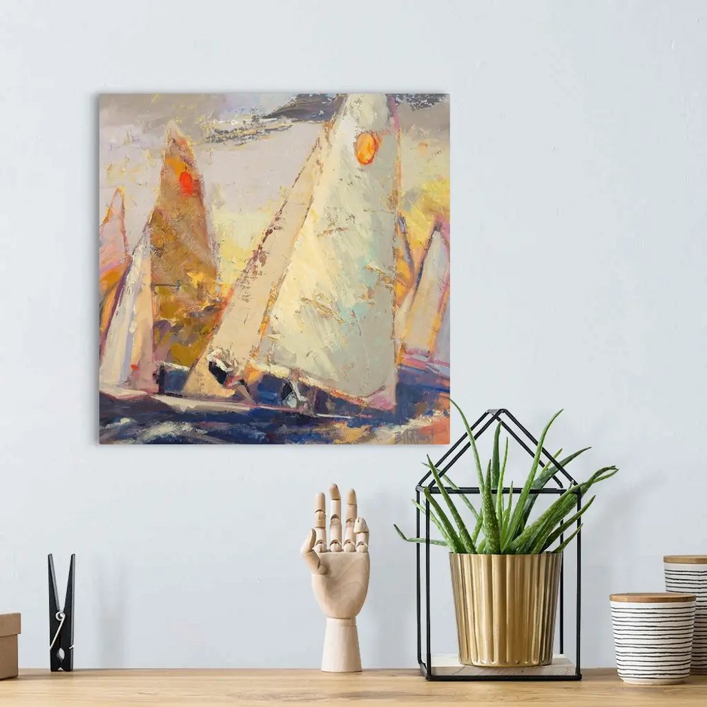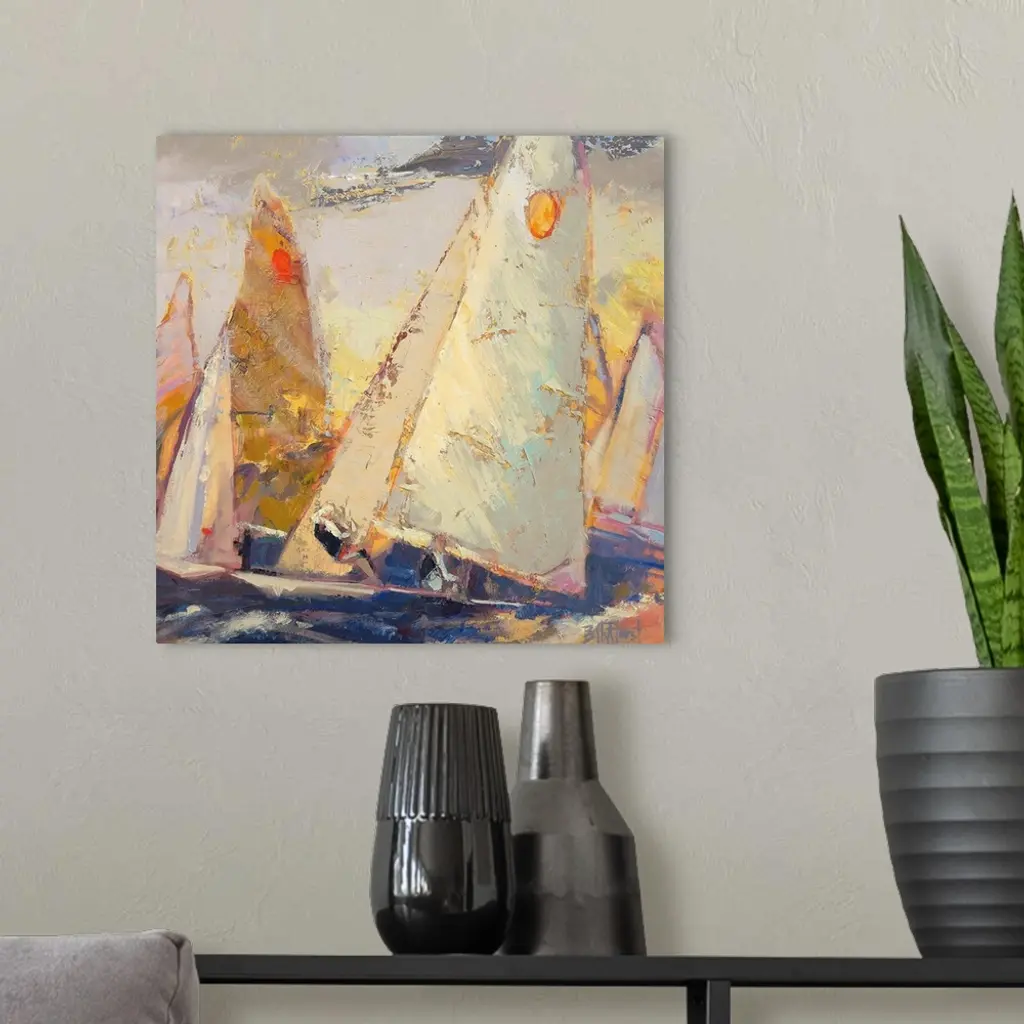 A contemporary coastal themed painting of sailboats sailing the open sea.