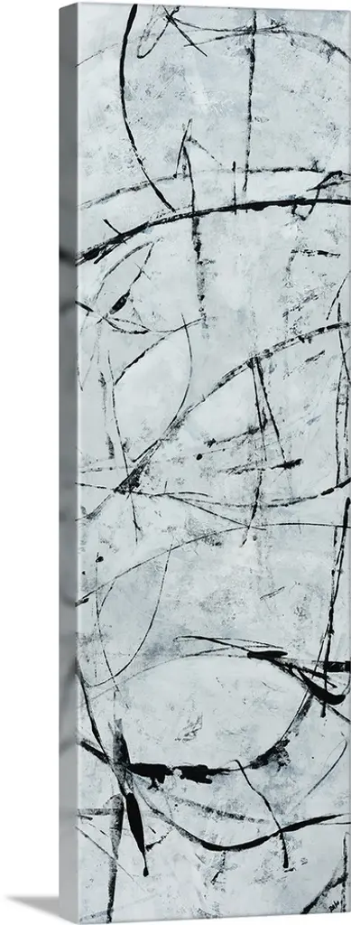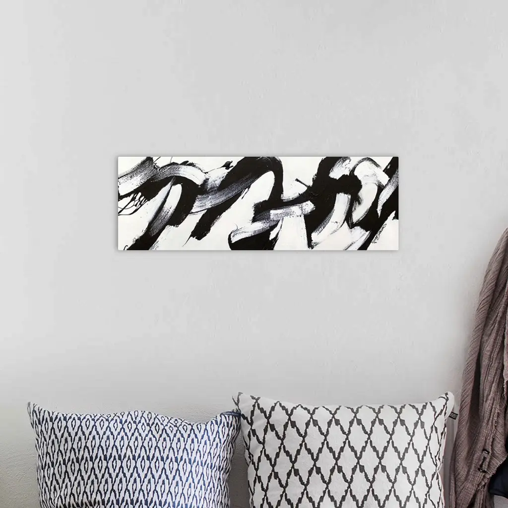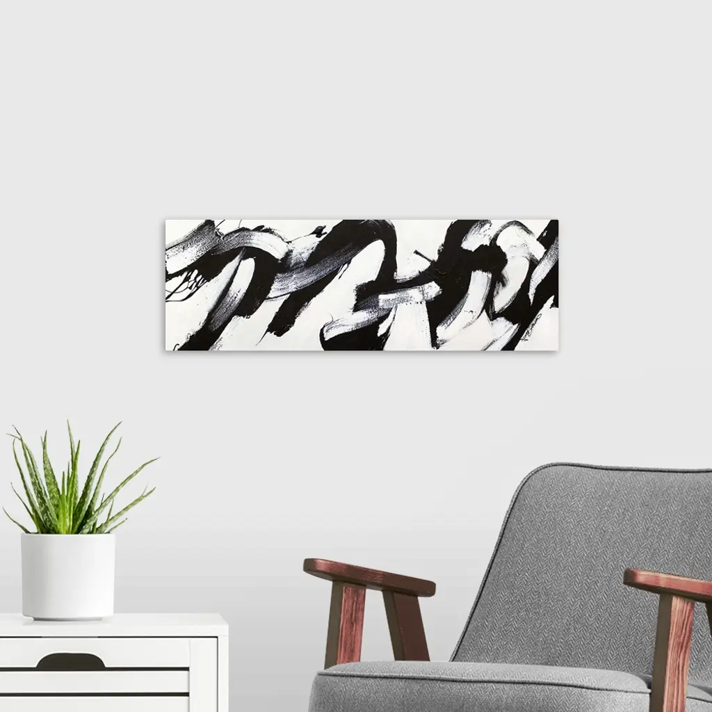 Contemporary abstract painting of bold black strokes of paint in fluid movements against a white background.