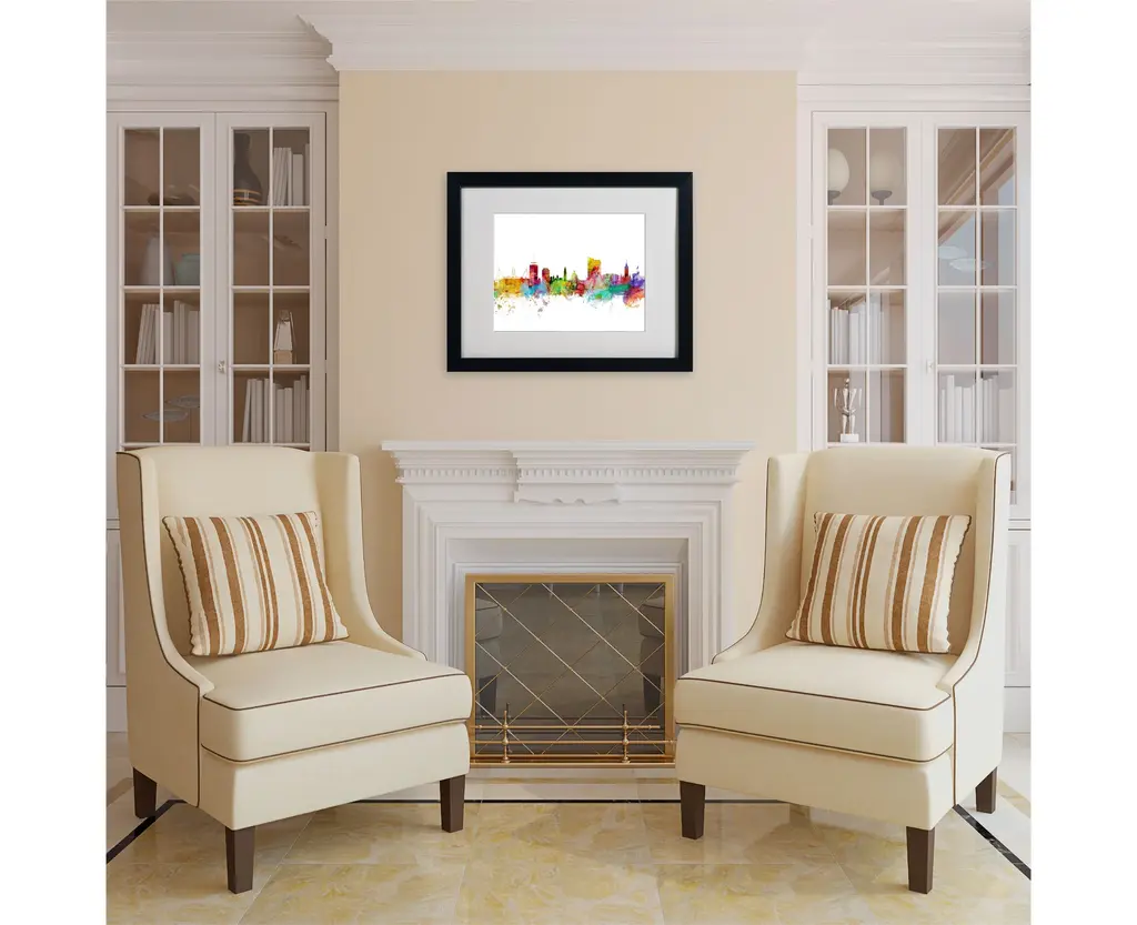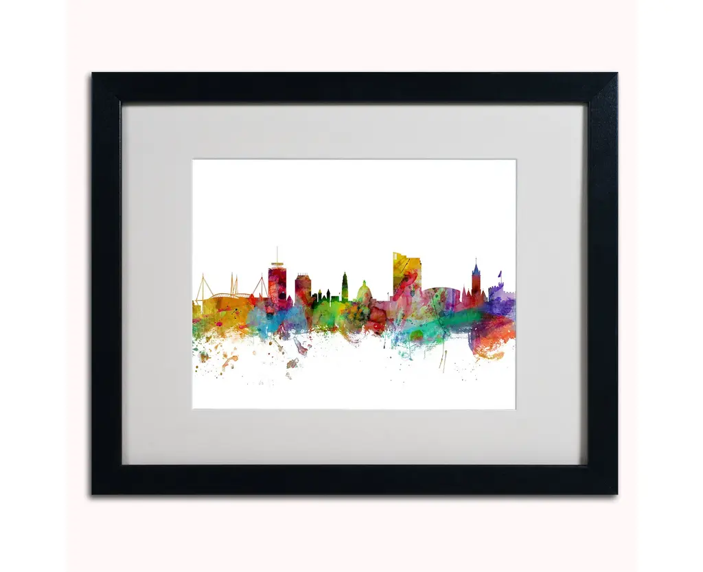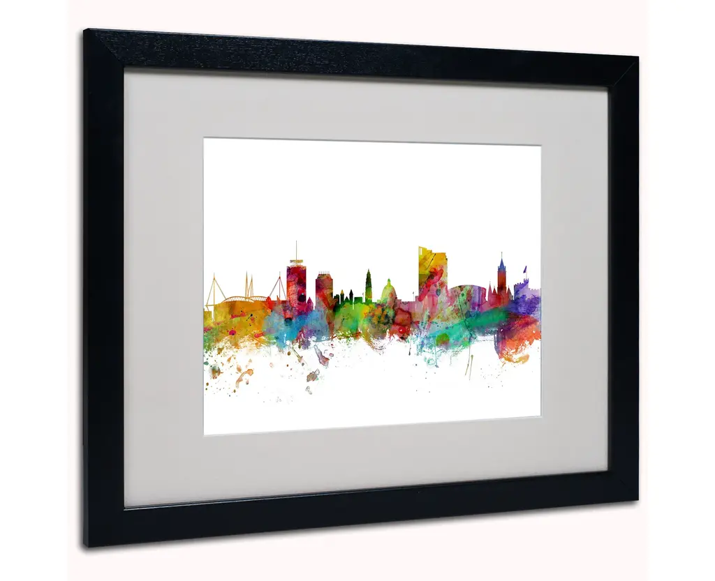 Title: Cardiff Wales Skyline IIArtist: Michael TompsettProduct Type: Matted Framed Canvas ArtMatte Color: WhiteFrame Color: BlackSize: 16" x 20"Made in the USA.Art and design were always Michael's favorite subjects at school. He was fortunate to land a job as a graphic designer at one of London's most prestigious publishing companies. After 12 years Michael Tompsett made the decision to pursue a full-time career creating his own work. The freedom and time to be able to focus solely on his own projects has been a wonderful experience. Although Michael likes to experiment with different styles and subjects, his main focus is on map art. He enjoys looking for unique and interesting ways to depict something familiar. Maps are visual representations of the world we live in, a world which is incredibly diverse. Apart from maps, Tompsett creates urban landmark and cityscape designs.An 11" x 14" giclee print under acrilyic in an 16" x 20" Black Frame. Giclee (jee-clay) is an advanced printmaking process for creating museum quality fine art reproductions. This high quality print is matted using White Matting and comes in a Black Frame. A clear acrylic facing is added to protect the print. The piece is fully assembled by professional framers and comes ready to hang.