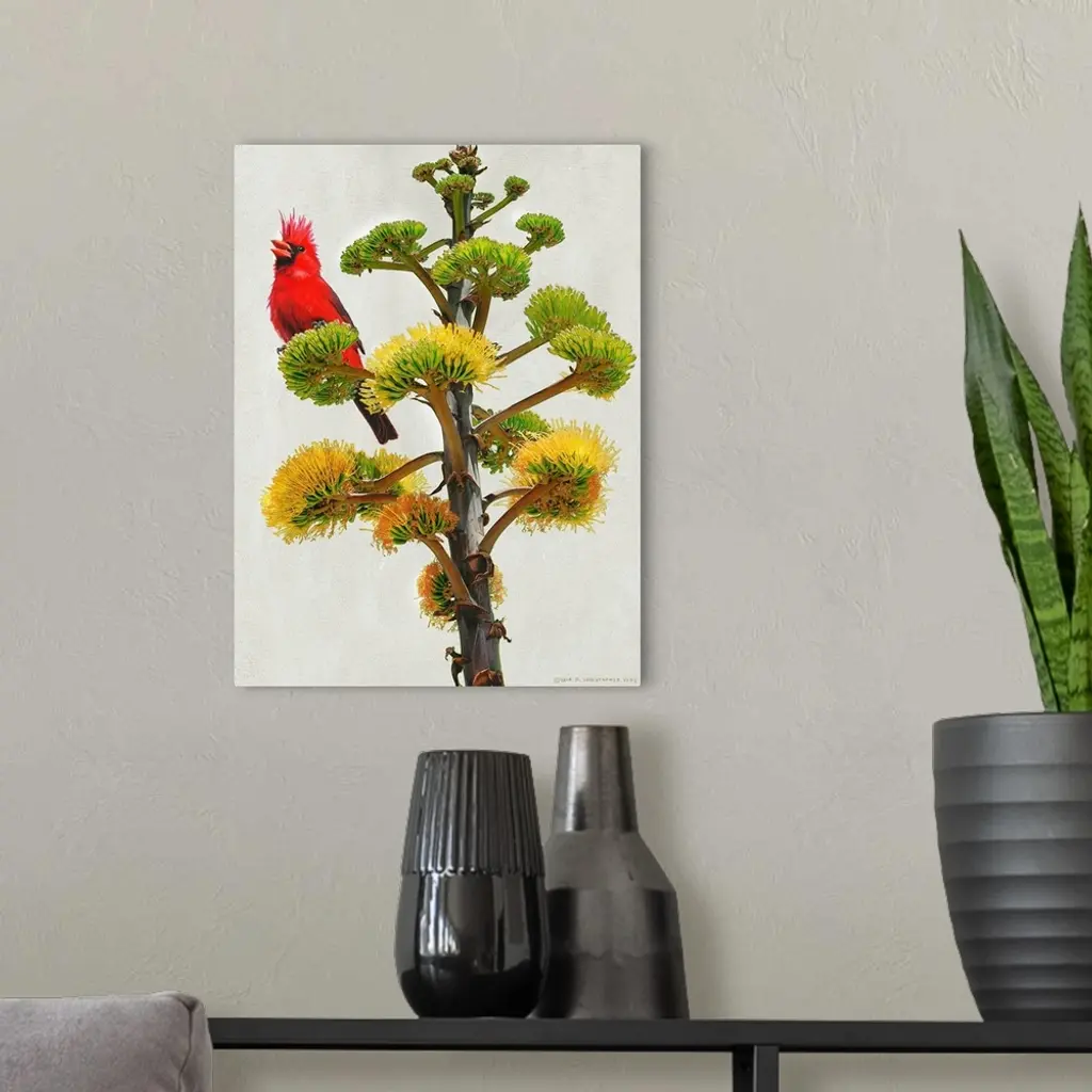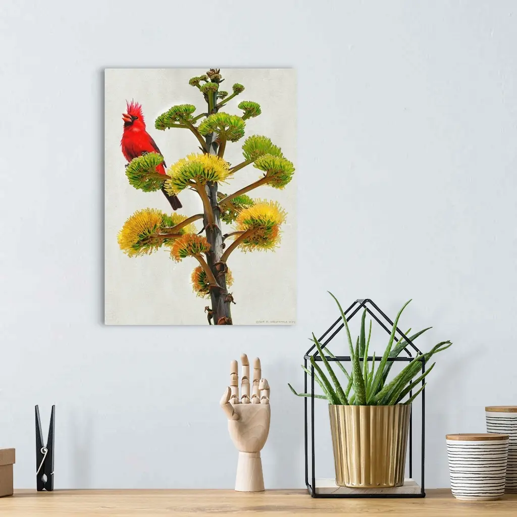 Contemporary artwork of a cardinal perched on a tree branch.